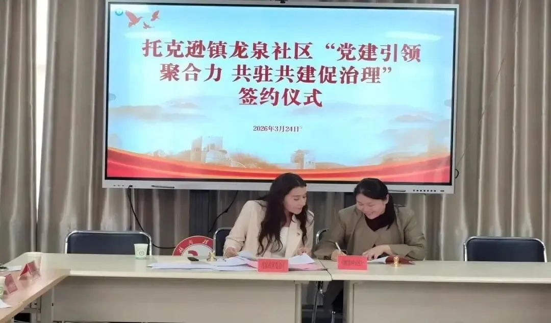 近日,支部牵头联合托克逊镇龙泉社区党总支、疆泰物业管理有限公司举行“党建引领聚合力 共驻共建促治理”签约仪式,启动基层治理协同共建模式。以党建为纽带构建组织联建、服务共办、治理共促的长效机制,精准对接居民急难愁盼问题,针对小区车棚无顶棚、公共饮水机故障、休闲座椅短缺等民生痛点,联合制定整改方案,切实将党建优势转化为惠民实效,推动物业服务与社区治理深度融合。