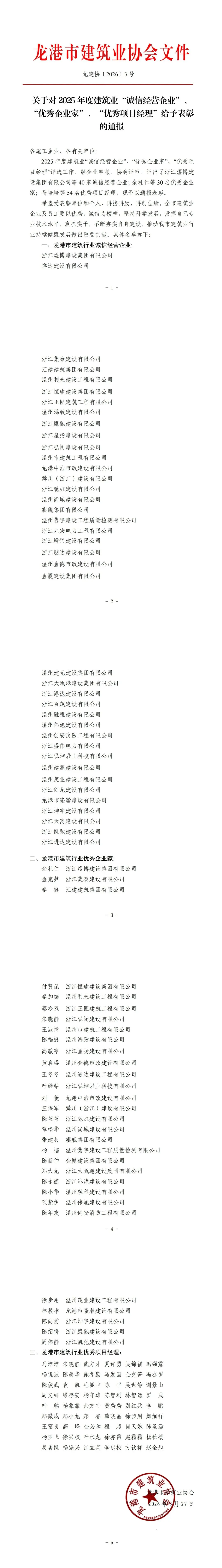 龙港市2025年度建筑行业“诚信经营企业”、“优秀企业家”“优秀项目经理”名单公布
