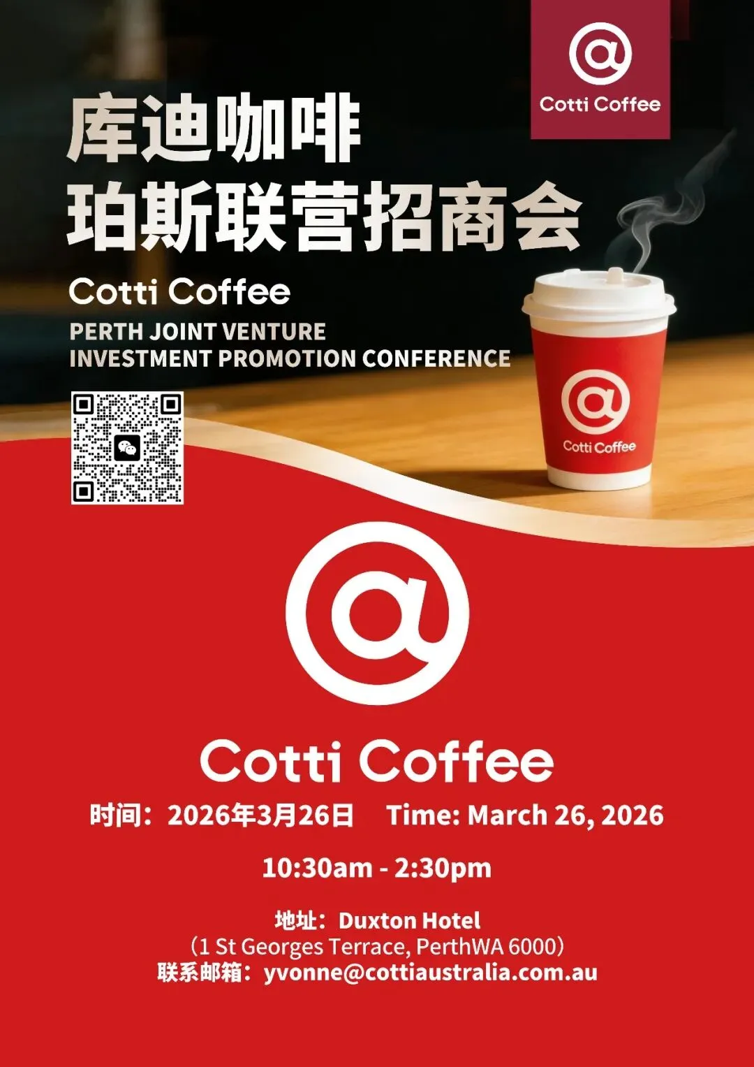 2026年3月26日,Cotti Coffee 西澳首场联营招商说明会在珀斯 Duxton Hotel 成功举行。本次活动吸引了来自本地的投资人、商业合作伙伴及餐饮行业从业者到场参与,现场反响积极。