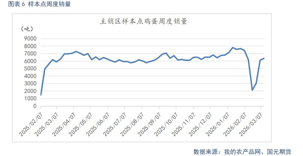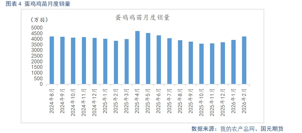 从新开产蛋鸡来看,二季度新开产蛋鸡数量对应2025年11月至2026年2月补栏鸡苗,据我的农产品网数据显示,2025年11月至2026年2月蛋鸡苗销量分别为3603万羽、3725万羽、3918万羽、4222万羽,呈现逐月递增态势,反映出养殖端补栏情绪持续升温,且3-5月为鸡苗补栏传统旺季,补栏积极性进一步支撑鸡苗销量走高。其中,4月新开产对应2025年12月补栏鸡苗,5月对应2026年1月补栏,6月对应2026年2月补栏,预计二季度新开产蛋鸡数量将逐月稳步增加,叠加春季产蛋率、蛋重季节性高位。整体来看二季度鸡蛋供给将呈现“新开产蛋鸡递增、淘汰放缓”的格局,产能去化节奏放缓,供给总量维持相对充裕水平。