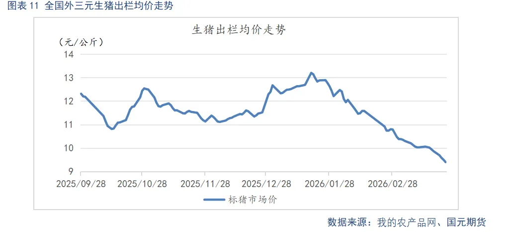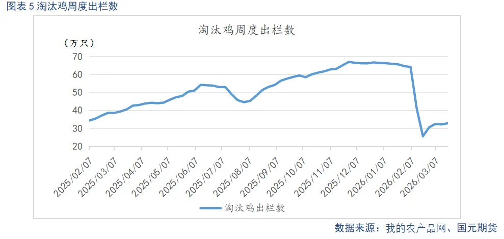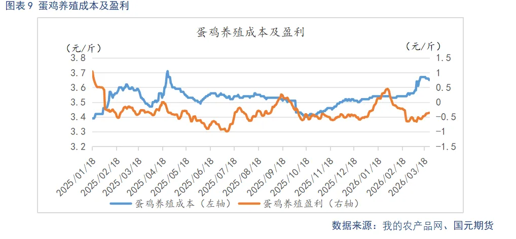 截至3月24日,蛋鸡养殖亏损为0.36元/斤,盈利较上季度末上升0.17元/斤。春节备货期间,鸡蛋价格大幅反弹,蛋鸡养殖一度由亏转盈,盈利水平明显改善,使得养殖端淘鸡意愿阶段性降温,产能去化节奏有所放缓。春节旺季结束后,鸡蛋市场重回供强需弱格局,蛋价快速回落,养殖利润随之由正转负并持续走弱,行业再度陷入深度亏损。尽管近期蛋价反弹,亏损幅度较前期有所收敛,但整体仍未摆脱亏损区间。后续养殖端补栏与淘汰行为将直接决定产能调控进度,若亏损持续或进一步加深,养殖端或加快低效产能出清,反之若亏损持续收窄,淘鸡积极性或再度偏弱,产能去化力度有限。