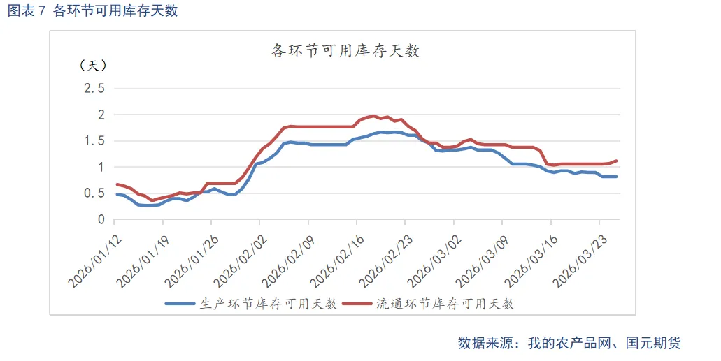 据我的农产品数据显示,春节假期结束后主销区需求快速回落,截至2月20日,当周销量降至2116.55吨的阶段低位,生产环节库存可用天数从2月初的1.05天攀升至2月25日的1.5天,流通环节同步回升,市场进入节后累库周期,淡季特征显著。进入3月,伴随返工返校全面开启,采购需求集中释放,主销区销量显著回暖,截至3月20日,当周销量回升至6064.46 吨,重回高位区间。同时生产环节库存可用天数同步回落至0.81天,库存去化加速,需求端迎来季节性修复。