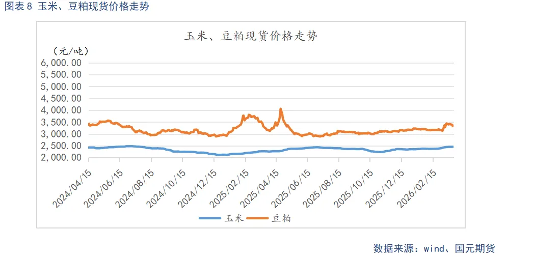 截至3月26日,玉米现货均价2452.55元/吨,较上季度末环比上涨100.98元/吨,豆粕现货均价3337.71元/吨,较上季度末环比上涨165.42元/吨。一季度玉米、豆粕走势偏强。玉米市场受基层余粮逐步见底支撑,叠加饲料与深加工企业刚需补库,价格偏强运行,4月虽有政策粮投放与农户售粮带来阶段性承压,但5月后进入青黄不接阶段,叠加新麦替代有限,价格整体呈现先稳后强格局。豆粕方面,短期受南美大豆到港延迟支撑高位,二季度中后期巴西大豆将集中到港,供应压力显现。同时下游养殖亏损下,采购以随用随买为主,需求端提振有限,价格将高位回落。综合来看,二季度玉米受低库存与刚需支撑维持偏强震荡,豆粕则先紧后松呈现冲高回落走势,饲料原料整体仍对养殖成本形成较强支撑。