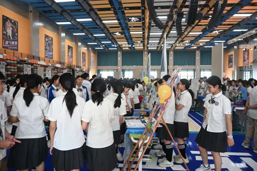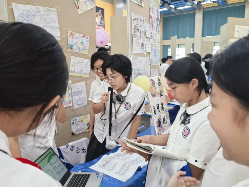 各班宣讲员手持扩音器精神饱满,口齿清晰。他们或慷慨激昂,或温婉细腻,用生动的语言和丰富的展示形式,将寒假里的点滴探索娓娓道来。初一展台前,同学们围成一圈,认真听实践团队讲述家乡的变化,眼中闪烁着好奇与自豪;高一展台则吸引了众多师生驻足,他们就调研报告中的热点问题展开热烈讨论,思维的火花在碰撞中不断绽放;初二展台前,同学们把探访经历、规则学习讲得生动有趣,不时传来轻声讨论;高二展区,同学们一边展示亮眼文创成果,一边带领大家现场体验制作乐趣,灵感分享与互动体验交织。观展期间,同学们或驻足聆听,或提笔记录,或交流探讨,整个会场洋溢着浓厚的学习氛围与探索热情。大家穿梭于展台之间,彼此学习,互相启发,实践的火花在交流中碰撞,成长的足迹在见证中延伸。