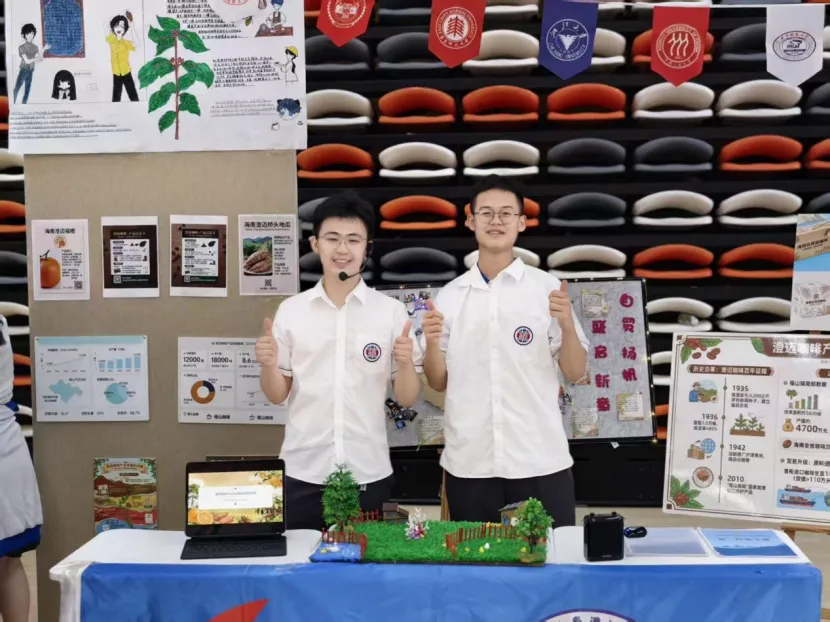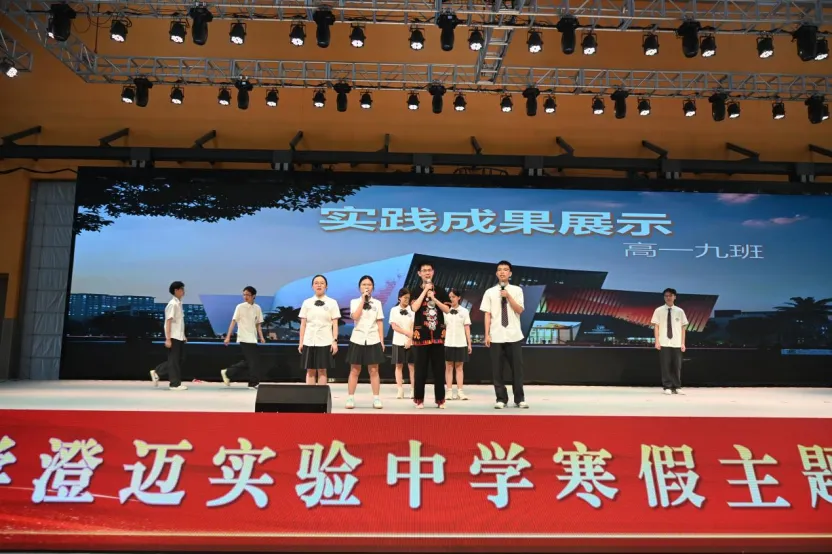 高一9班将目光投向了“本土产业调研”。在班主任高升老师带领下,深入海南省非物质文化遗产展示中心与澄迈福山咖啡园,从产业链角度调研了企业在自贸港背景下的机遇与挑战。舞台上,他们用形象生动的展示、理性的分析,调研探寻产业发展,以青春视角解读自贸港脉搏。