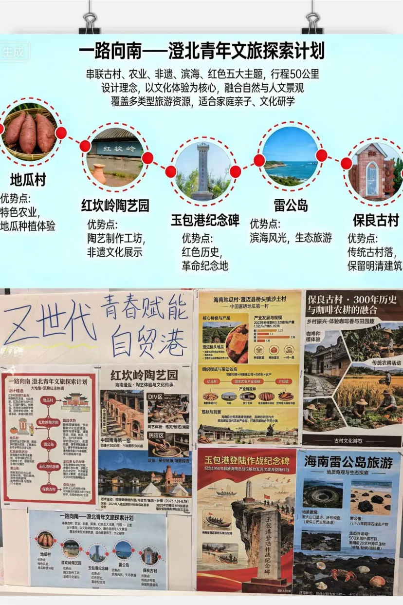 高二2班开展“一路向南——澄北青年文旅探索计划”,沿50公里路线走访红坎岭陶艺园等5个点位,调研发现澄北文旅存在内容同质化、客群固化等四大痛点。团队结合各点位特色提出破局方案,设计高性价比两日游线路,建议以文化为魂、整合资源打造线路,助力澄北文旅升级。