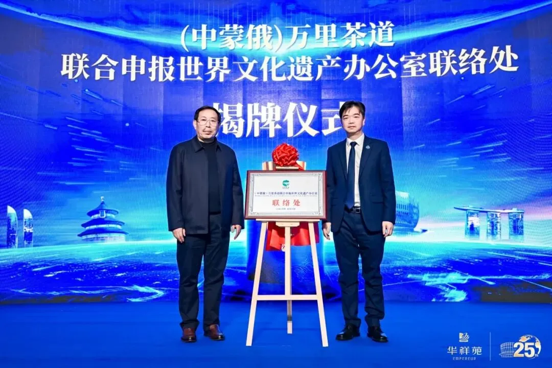 现场,(中蒙俄)万里茶道联合申报世界文化遗产办公室联络处、世界百茶体验中心宣布成立。