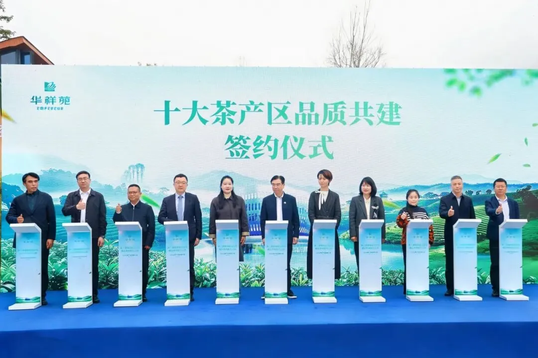 △3月22日,2026茶产业品质共建签约仪式现场,福建省武夷山市、安溪县、福鼎市、古田县、政和县,云南省勐海县、勐海县布朗山乡、麻栗坡县、浙江省安吉县、河南省信阳市十大核心产区嘉宾与华祥苑共同签约(华祥苑供图)