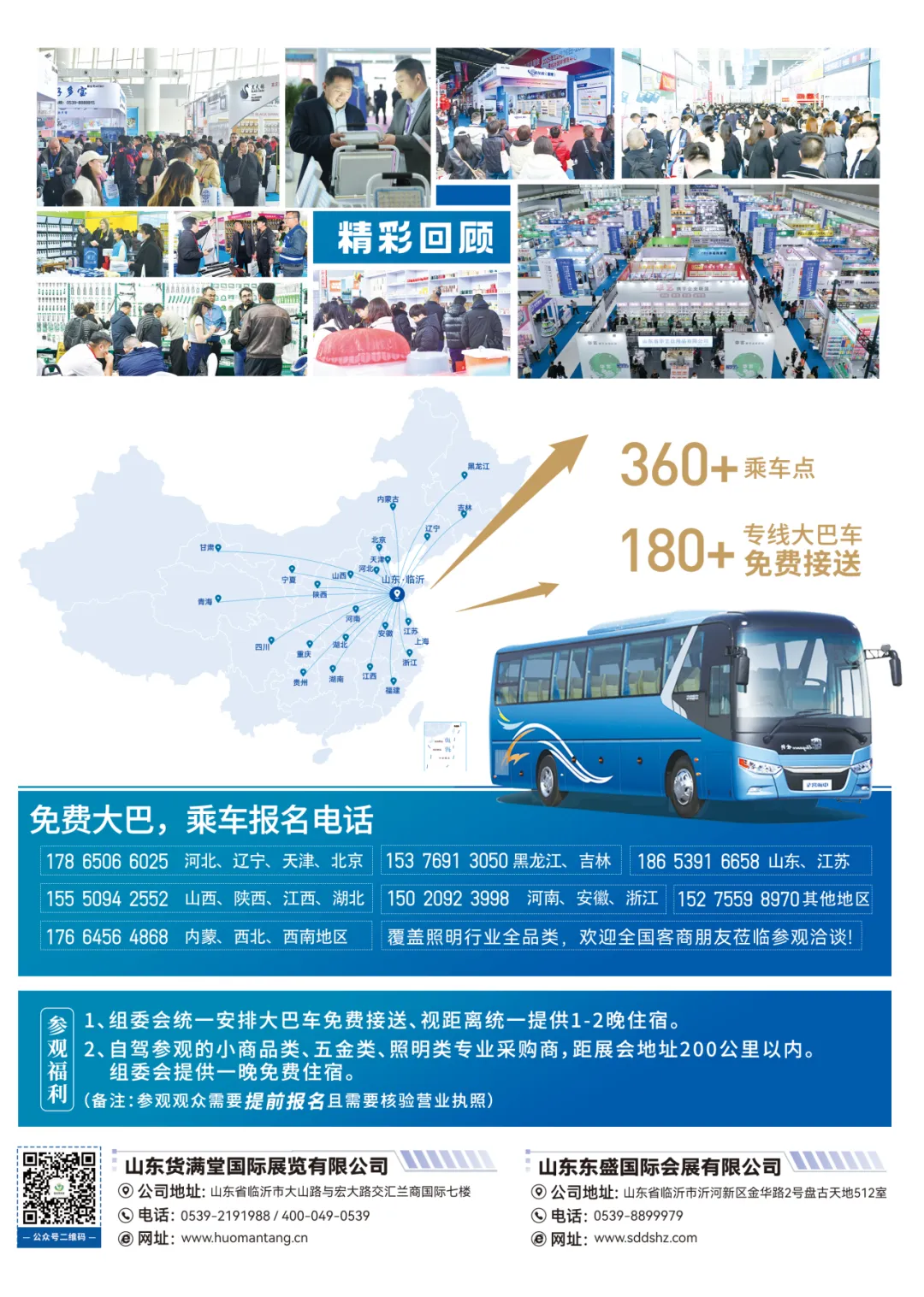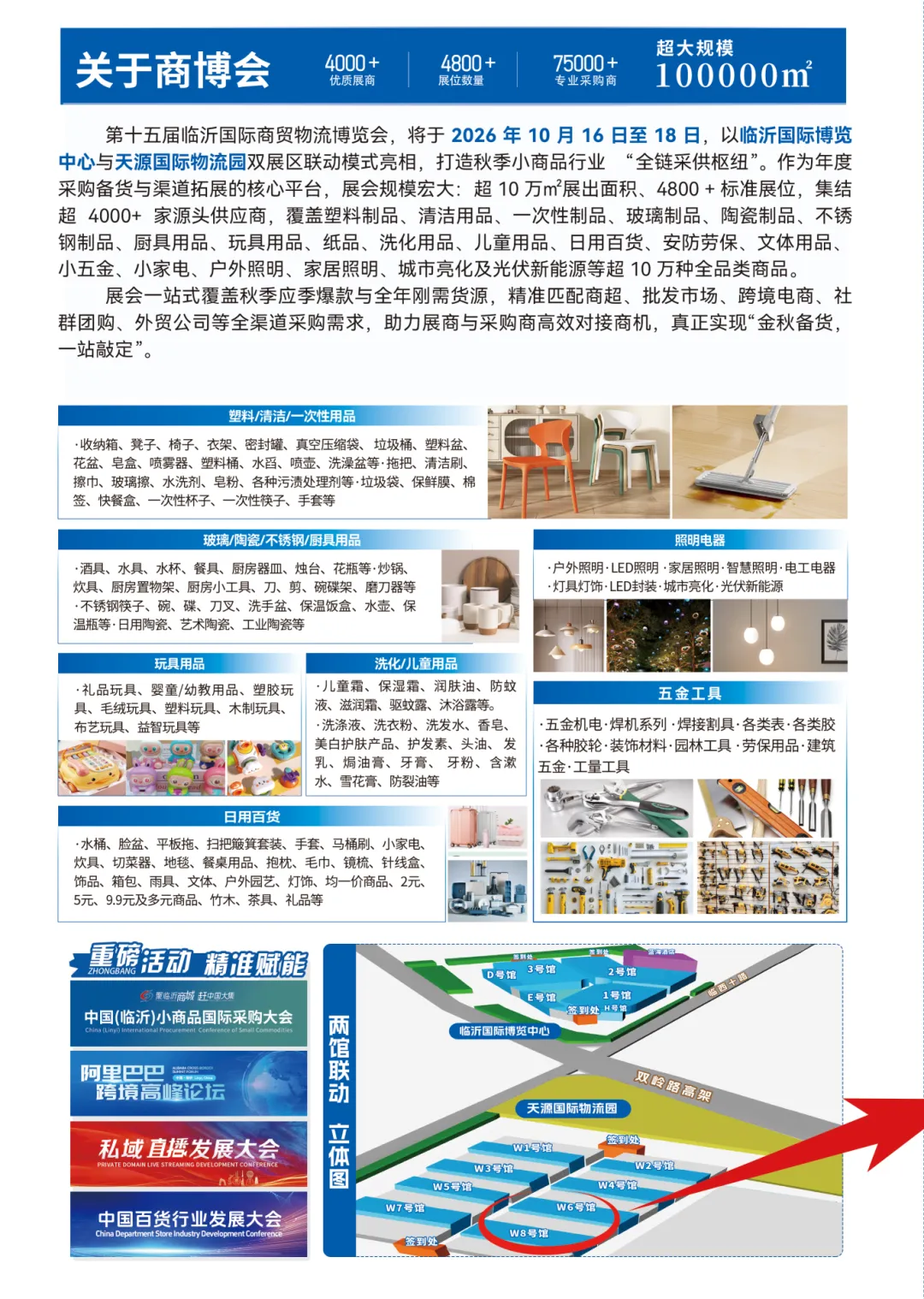 “第15届商博会”是与“第23届临沂小商品博览会”同期共开,规划展馆12个。总面积近80000㎡,涵盖全品类小商品、小五金、照明类产品。单届专采人数均能超越40000人 数十万人次。在长江以北拥有360多个发车点,180辆(这一直是谦虚的说法,实际上单届基本都超越300辆)以上的大巴车免费接送专业采购商。“商博会“”临博会”长江以北国内最大的小商品展与义乌小商品博览会一南一北遥相呼应。