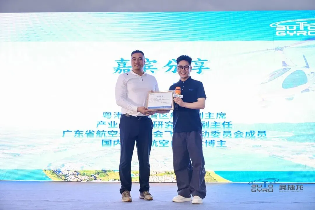 在推广大使授聘仪式环节,粤港澳大湾区航协副主席、广东省航空运动协会飞行运动委员会成员吴维被授予“奥捷龙品牌飞行推广大使” 称号并登台分享。