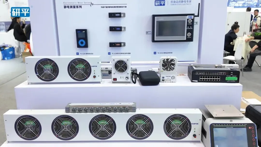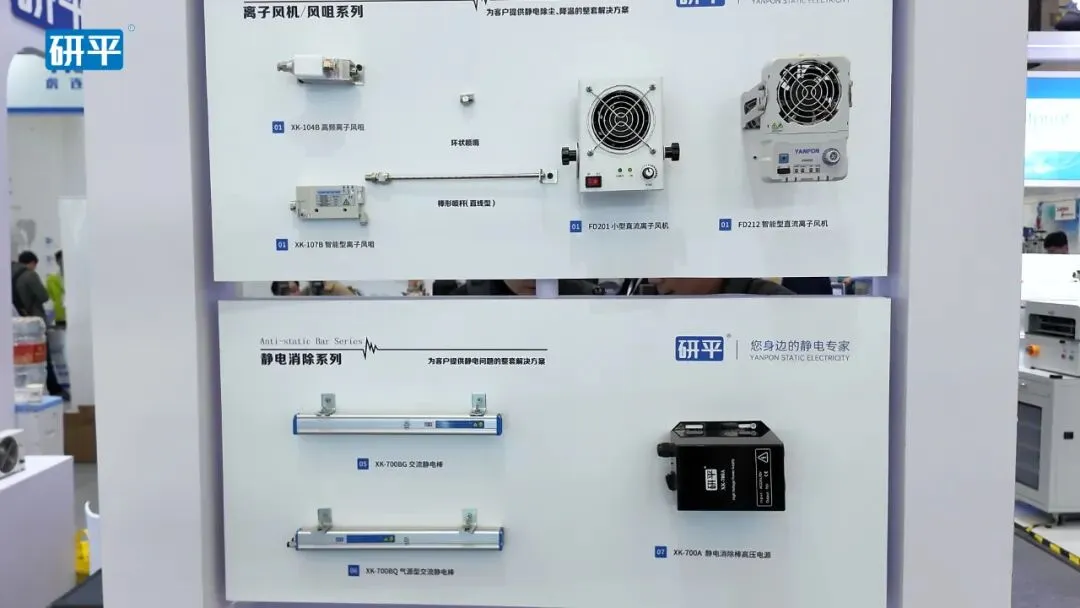 现场展示的芯片制程设备、封装测试设备等有安装研平静电消除装置,解决静电放电击穿芯片、吸附粉尘杂质、干扰电路信号、静电电击、设备误动作停机等电子行业常见痛点,助力企业提升成品良率、降低生产损耗、保障人员与设备安全。