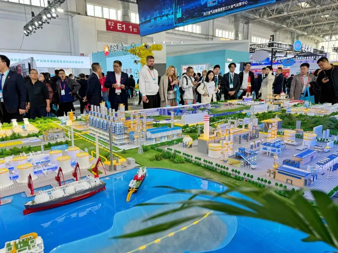 来自各个国家和地区的观众在中国石油展区的一体化沙盘前驻足观看。
