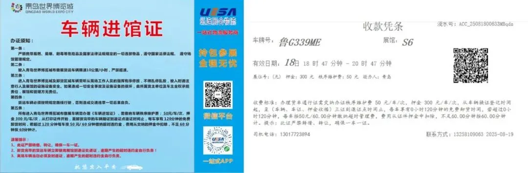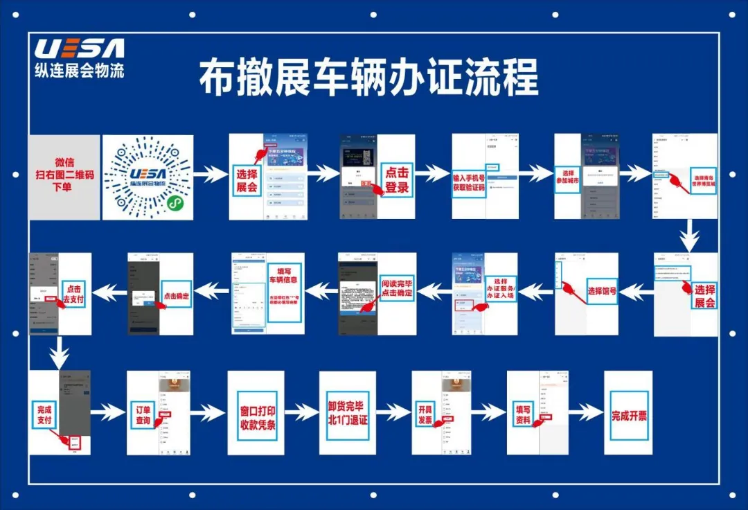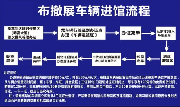 进入明富大道待停区(排队等候办证)→持证车辆左转驶入青草河桥 →世博中路→从东 1 门驶入展馆,进入东 1 门后直行依次到达 N1、N2 馆;