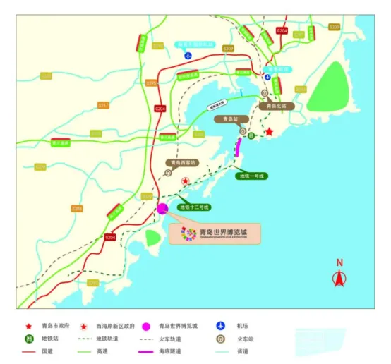 ●青岛胶东国际机场青岛胶东国际机场地铁站乘坐地铁8号线,到青岛北站转1号线,井冈山路转13号线,盛海路(世博城)地铁站A口出,可步行(800米)至展馆。