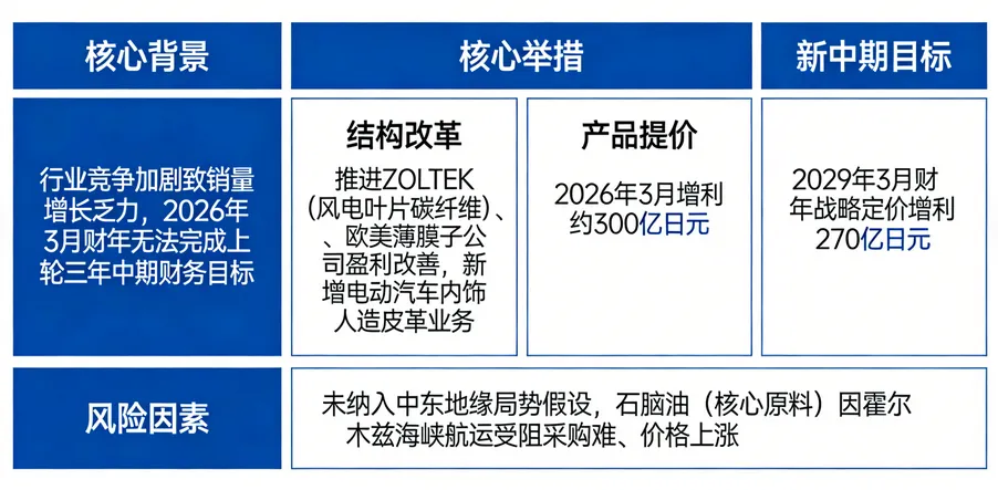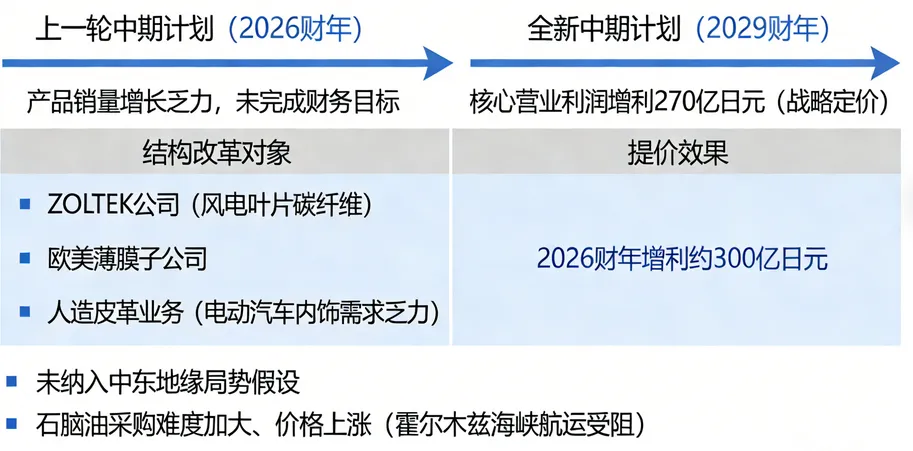 在全新中期计划周期内,东丽将持续推进上述两大核心举措。定价策略方面,目标到 2029 年 3 月财年,通过战略定价实现核心营业利润 270 亿日元的增利效果;结构改革方面,将持续推动主营风电叶片等通用级碳纤维的 ZOLTEK 公司、欧美薄膜子公司的盈利改善,同时将电动汽车内饰用需求增长乏力的人造皮革业务,新增纳入改革对象。