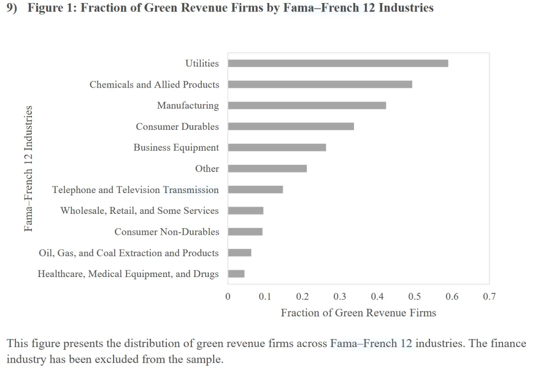 在进行严密的回归之前,作者首先展示了数据的分布特征。 Figure 1 展示了绿色收入企业在 Fama-French 12 个行业中的分布比例。令人略感意外但极具经济学合理性的是:公用事业(Utilities)、化学工业(Chemicals)和制造业(Manufacturing)拥有最高比例的绿色收入企业。虽然这些传统上被视为“棕色”或高污染行业,但正如 Cohen 等人 (2023) 所指出的,棕色企业为了生存与转型,往往是绿色创新与清洁技术应用的最积极领导者,这为本文的“转型属性”提供了生动的注脚。