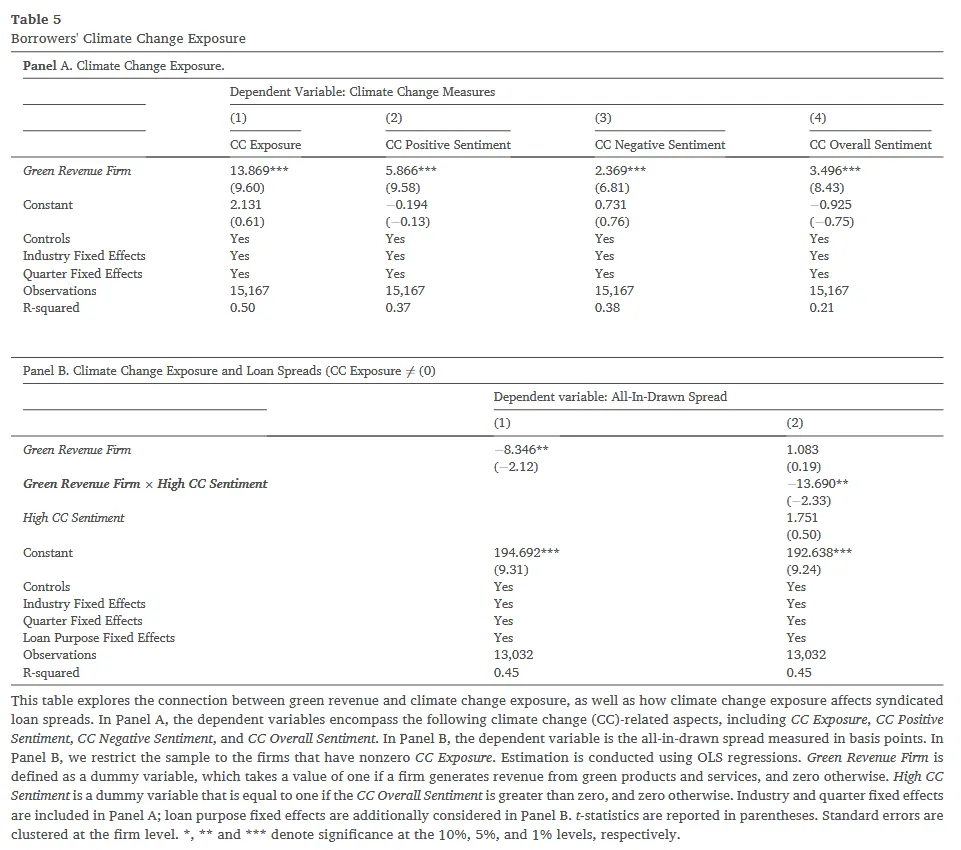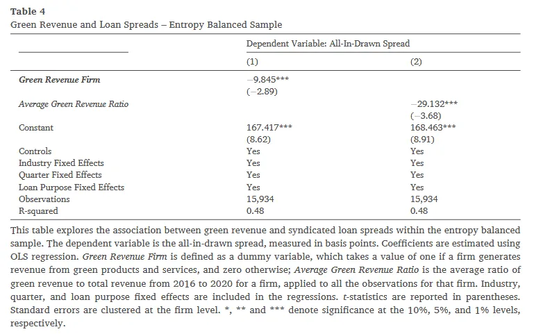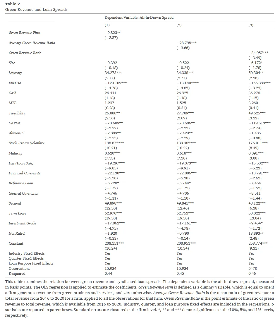 在传统的信贷审批流程中,银行主要关注企业的杠杆率、抵押品价值和现金流覆盖率。但在这笔交易中,牵头行注意到该借款人拥有一项极其有利的特质:显著的绿色收入。对于银行而言,向此类企业发放贷款,不仅能够向外界证明其正在积极支持实体经济的绿色转型,还能有效对冲气候变化带来的长期违约风险。因此,作为对这种“绿色商业模式”的奖励,银团决定给予该企业比同行业没有绿色收入的同行更低的贷款利率加点(Loan Spread)。这种融资成本的实质性降低,不仅是对企业既有绿色业务的认可,更是对未来持续进行绿色创新的激励。本文的核心故事正是通过海量数据去验证这一信贷定价逻辑是否在宏观层面上系统性地存在。