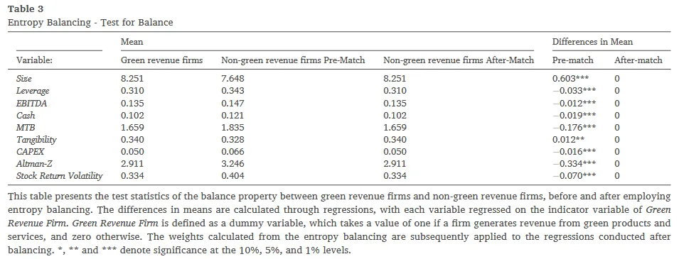正如表1所示,绿色收入企业与传统企业在资产规模、杠杆等诸多协变量上存在系统性差异,这种不可观测的选择偏差可能导致 OLS 存在模型设定偏误(Model Misspecification)。为解决这一内生性顾虑,作者并未采用传统的倾向得分匹配(PSM),而是采用了更前沿的熵平衡法(Entropy Balancing; Hainmueller, 2012)。