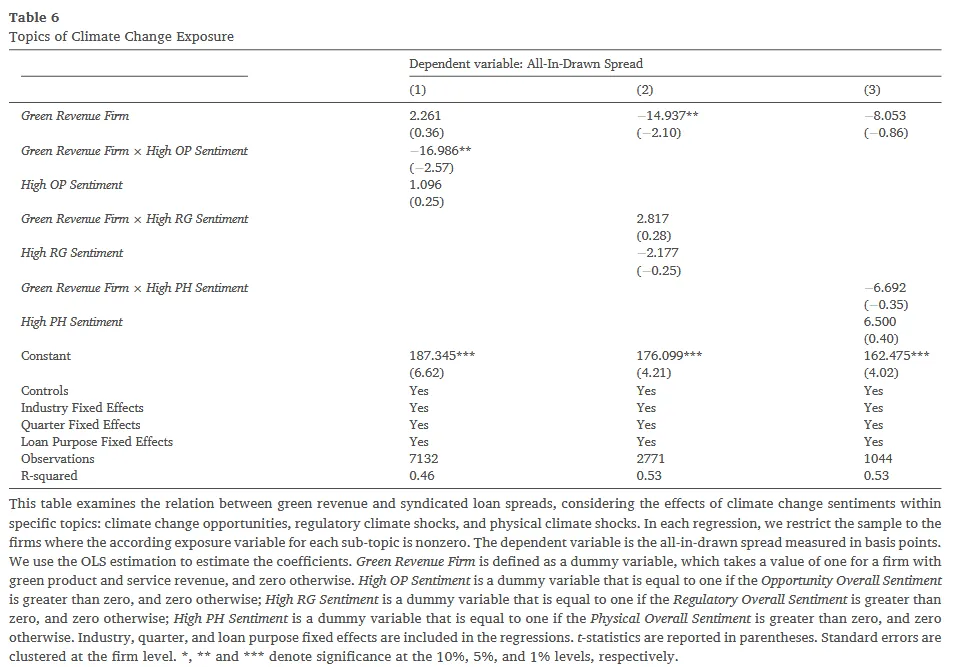 Table 6 进一步将气候变化拆分为三个具体的细分议题:气候机遇(Opportunities)、监管冲击(Regulatory Shocks)和物理冲击(Physical Shocks)。回归结果显示,交乘项 Green Revenue Firm × High OP Sentiment (高气候机遇情绪) 的系数为 -16.986 (5%显著),而与监管情绪和物理情绪的交乘项均不显著 。这一机制彻底打通了因果链条:银行之所以降低信贷利差,是敏锐地捕获到了绿色产品能为企业带来转型期的新利润增长点与市场机遇,而非仅仅是被动防御监管风险。