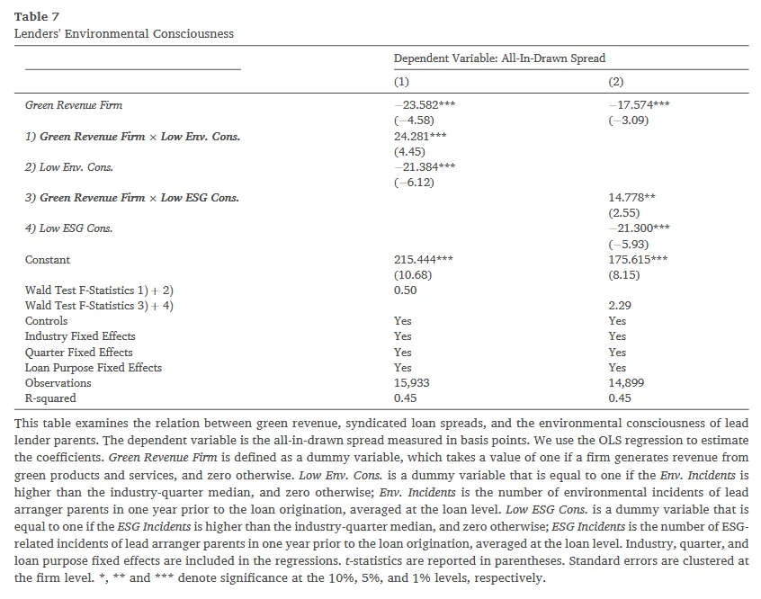 Table 7 的结果极具解释力:Low Env. Cons. 本身的系数为负(-21.384),这意味着高环境意识的银行(基准组)通常对非绿色企业收取更高的贷款利差作为风险惩罚;然而,交乘项系数高达 24.281 且高度显著。Wald 测试表明主效应与交乘项之和不显著异于零 。这说明,具有高度环境意识的银行虽然对传统企业实施了更高的风险惩罚定价,但一旦借款人拥有了实质性的绿色收入,这种惩罚性的高息将被完全豁免并抵消 。这也是支持研究结论的重要机制。