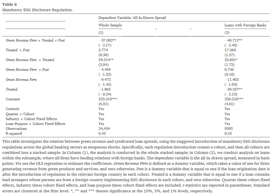 第三,为强制性ESG披露法规的溢出效应提供了信贷市场的实证证据。近期的文献(如 Krueger 等人, 2023; Wang, 2023)开始关注ESG披露强制化的实际经济后果,但关于这些政策如何通过跨国银行网络影响联合贷款定价的证据极为罕见(Christensen 等人, 2021)。本文通过手工收集非美国银行母国实施强制性ESG披露法规的准自然实验数据,巧妙地证明了这些法规有效地唤醒了银行的ESG意识,进而促使这些外国银行在面向美国市场放贷时,给予具有绿色收入的企业更低的利率。这为政策制定者实施强制性信息披露提供了来自信贷定价渠道的坚实依据。