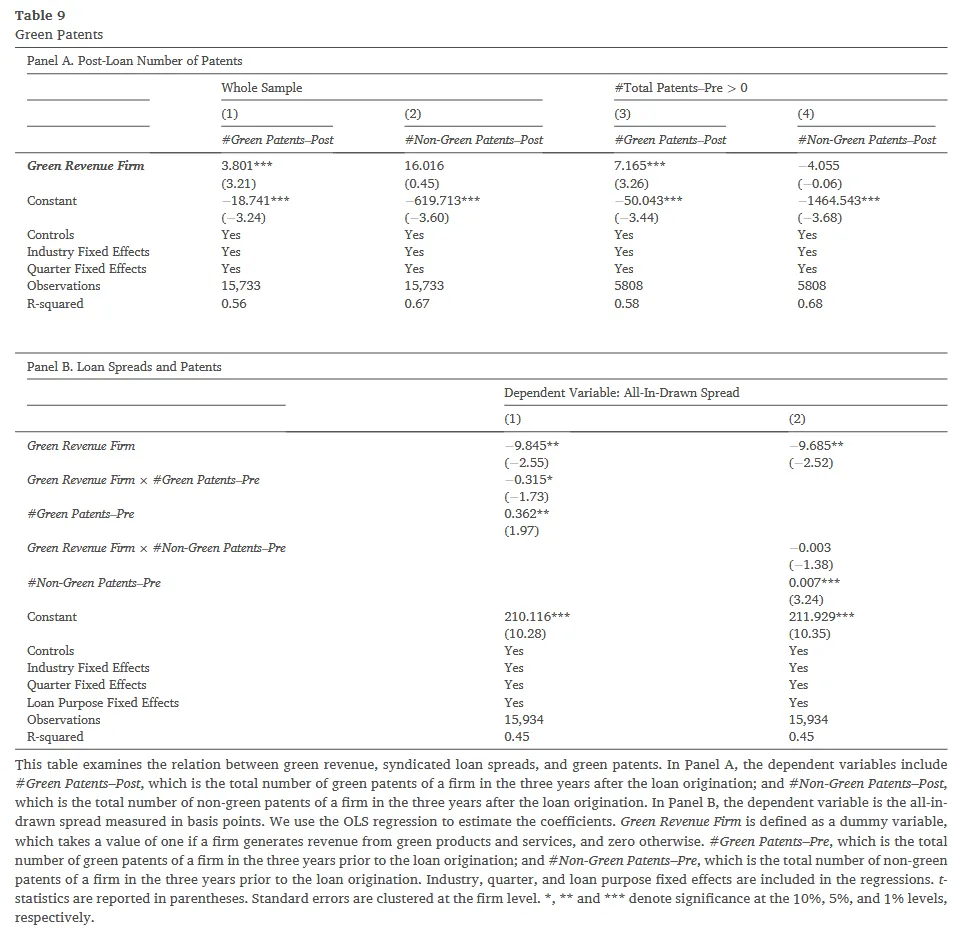 作者利用 OECD 分类与 Kogan 专利数据库分析了这一问题。Table 9 Panel A 考察了获得低息贷款后的真实效果。回归结果显示,拥有绿色收入的虚拟变量在预测 贷款后三年内绿色专利申请数量 (#Green Patents-Post) 时的系数为 3.801(1%显著),而对非绿色专利(Non-Green Patents)的预测则毫不显著。这表明,绿色企业并未普遍增加所有类型的研发,而是将通过优惠信贷节约的资金精准地投入到了能够强化其核心环保竞争力的绿色创新中,形成了良性循环。