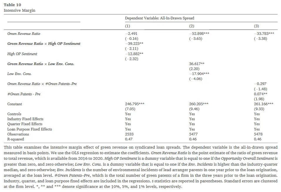 为了保证结论的极度稳健,作者在 Table 10 中用连续变量 Green Revenue Ratio 替代了虚拟变量,重做了各种交乘项机制检验,结果(如高气候机遇情绪下的进一步降息效应)依然高度显著一致,确立了集约边际(绿色占比越高,利差越低)的存在。
