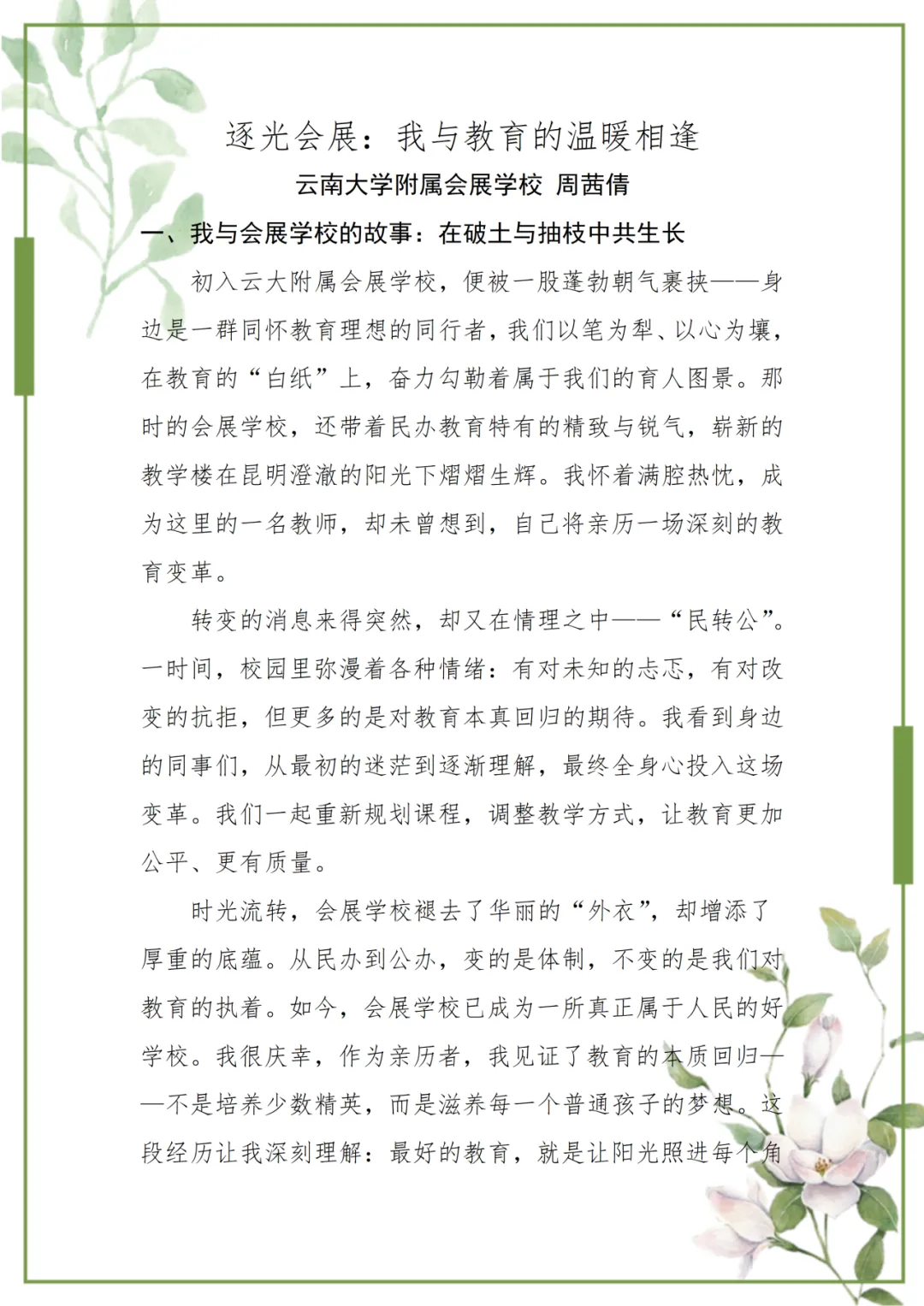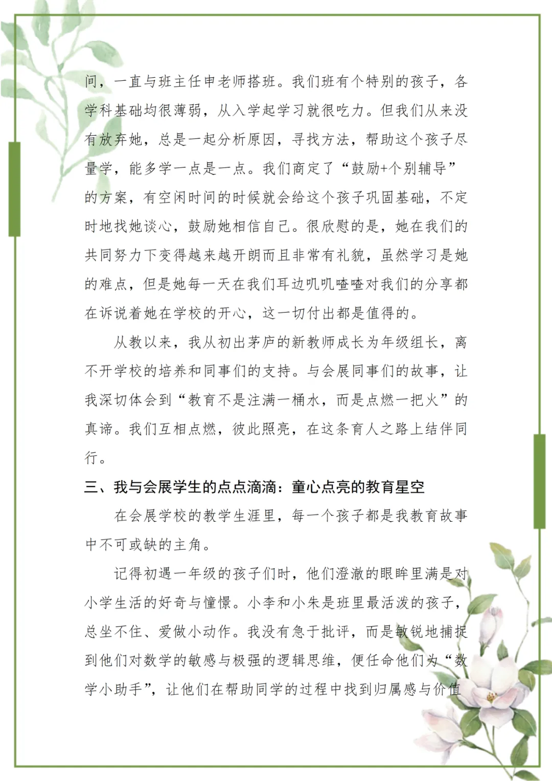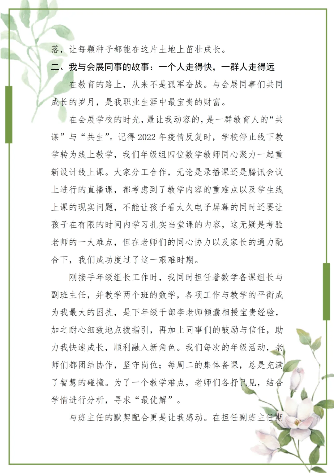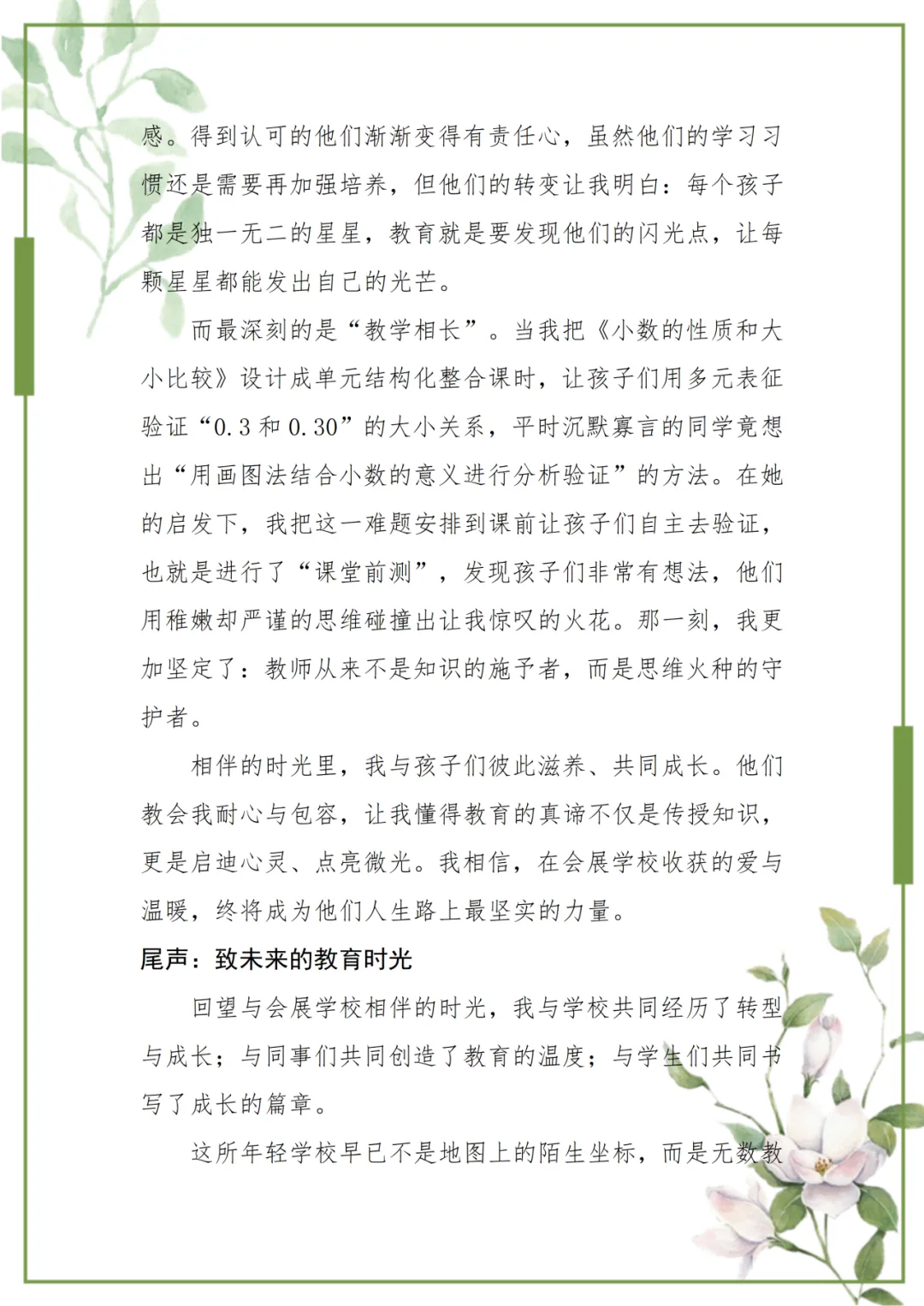 周茜倩老师站在时光的渡口回望:五年时光,是一位青年教师与一所学校的双向奔赴,是教育变革中的初心坚守,是育人路上的温暖共生。于她而言,会展学校早已从陌生的坐标,变成承载着无数温情的港湾。那些灯下的教研、课间的笑语、成长的蜕变,都在诉说着“教育即成长”的深意。这是一场以爱为舟、以智为桨的修行,她与会展同行,在岁月里沉淀力量,继续向着点亮更多孩子未来的远方,坚定前行。