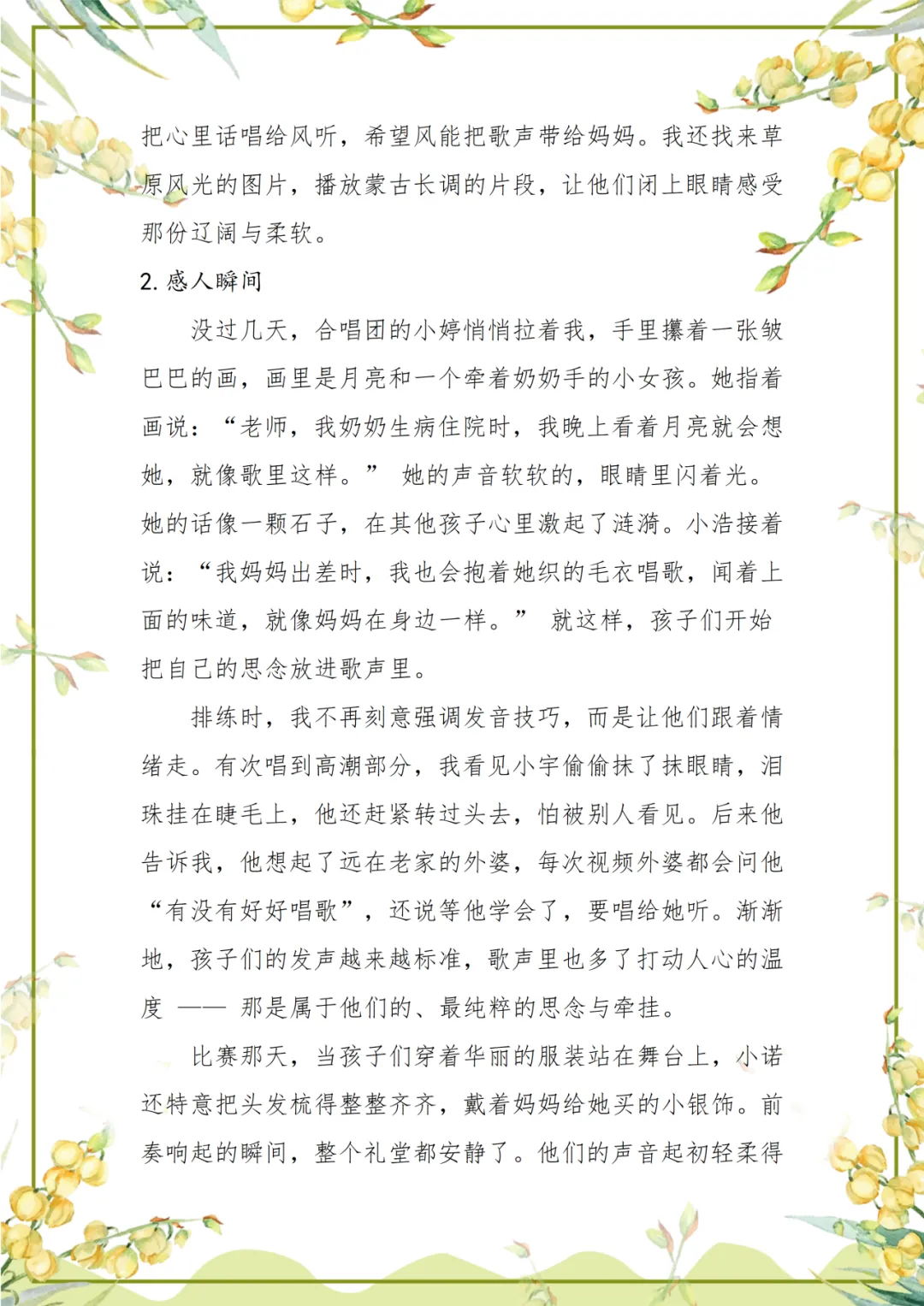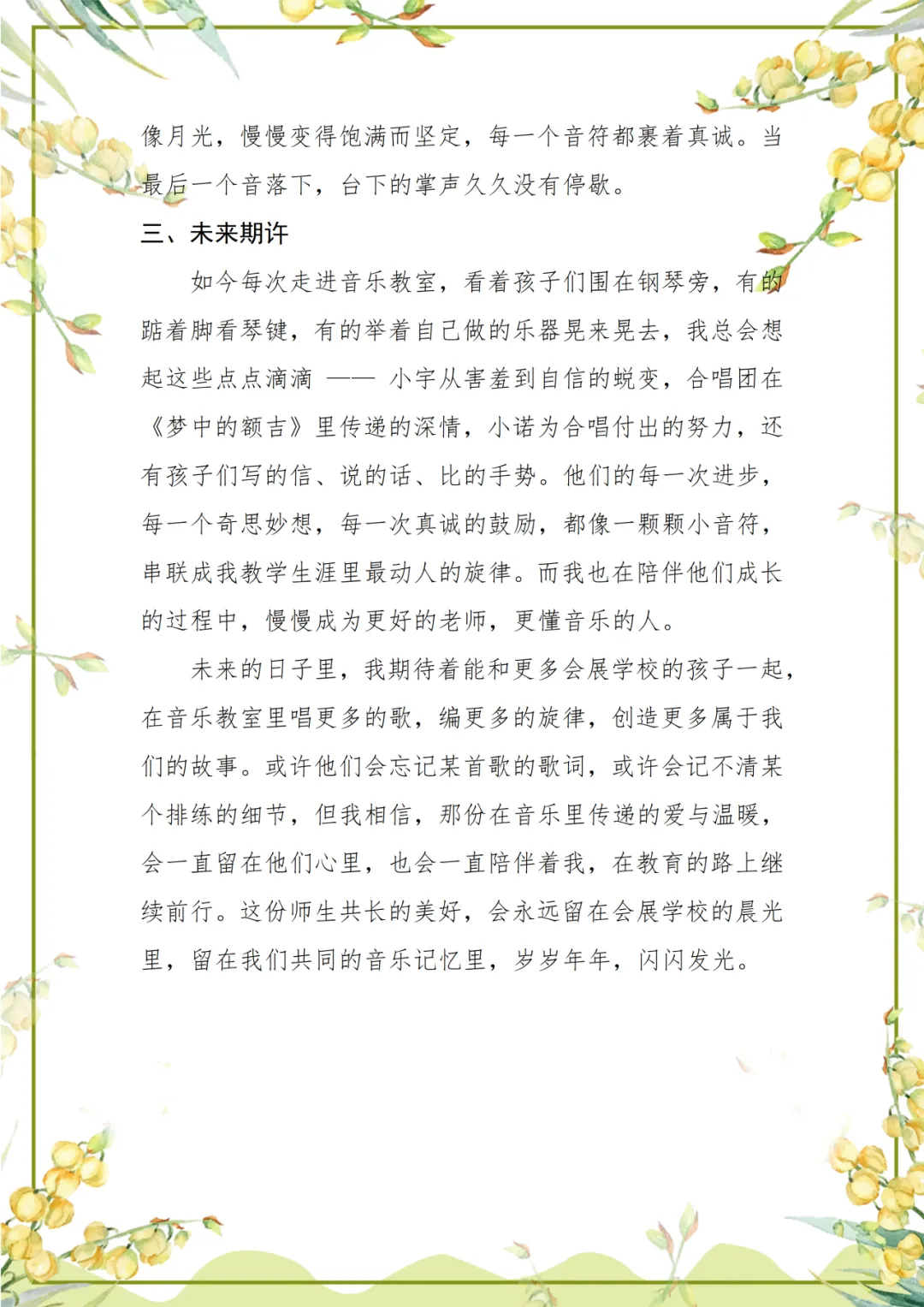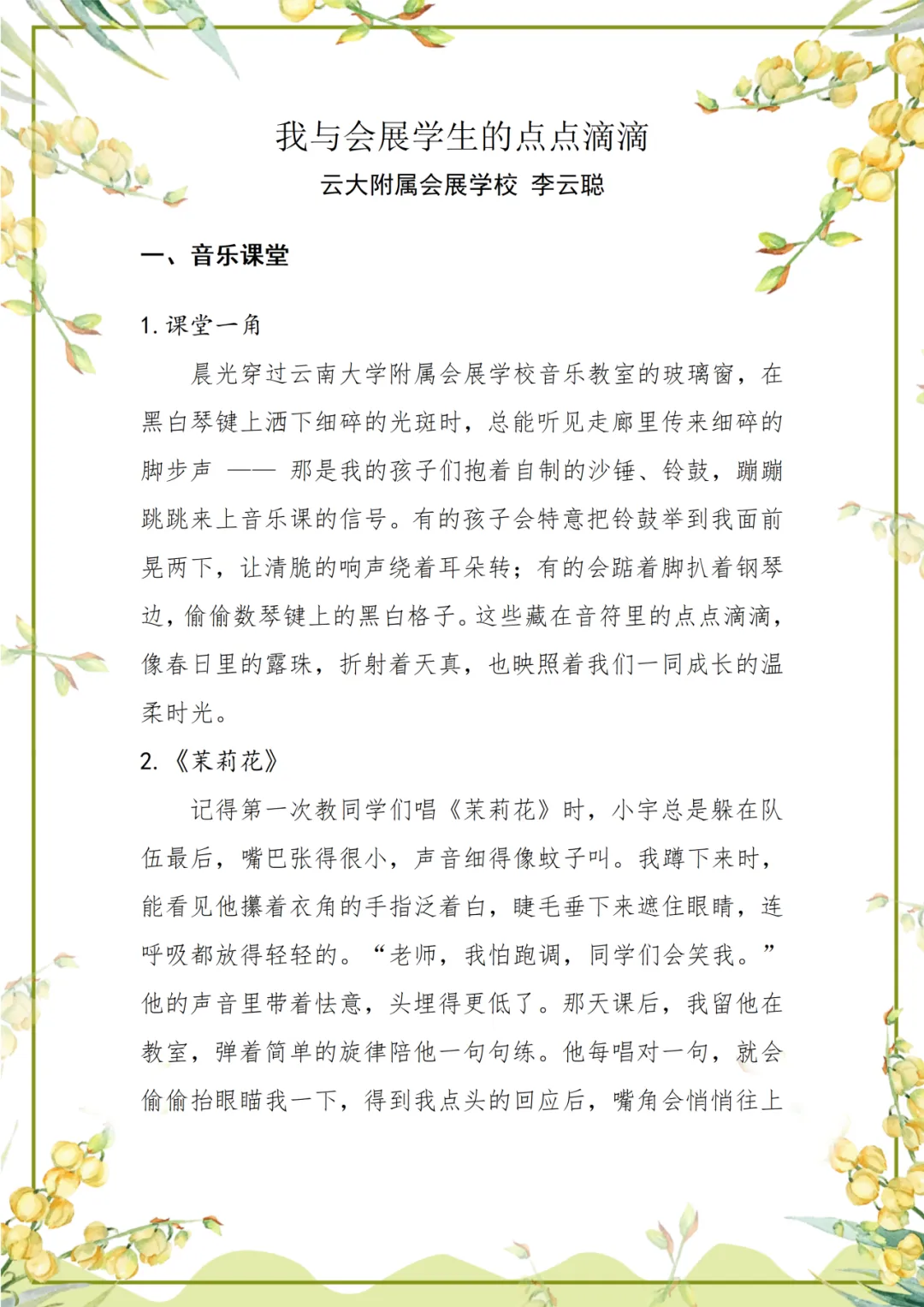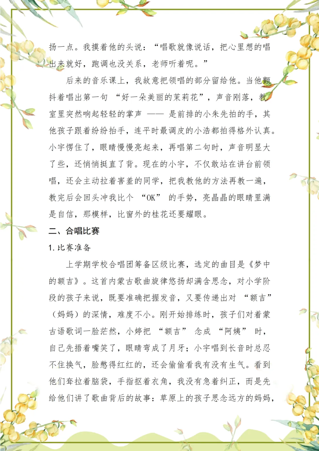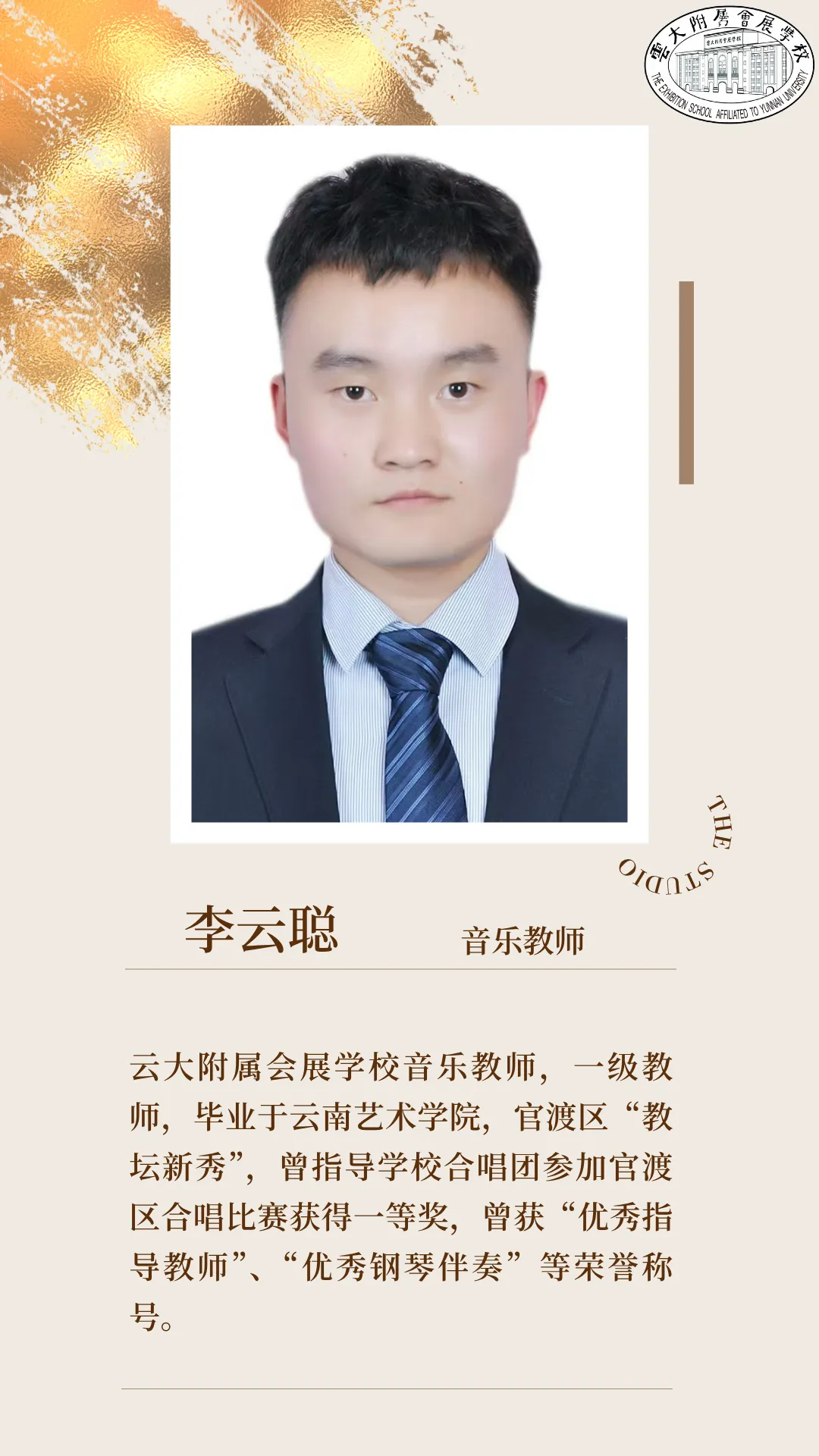 在李云聪老师的记忆中,那些透过玻璃窗散在琴键上的光斑,是会展校园音乐教室最温柔的序章。从《茉莉花》里怯生生的吟唱,到《梦中的额吉》中满含思念的和声,孩子们在音乐里蜕变得自信明亮,李老师也在陪伴中读懂了教育的温度。岁月流转,或许歌词会被遗忘,细节会被模糊,但那些藏在旋律里的勇气与温柔,终将留在师生共同的音乐记忆里,岁岁年年,闪闪发光。