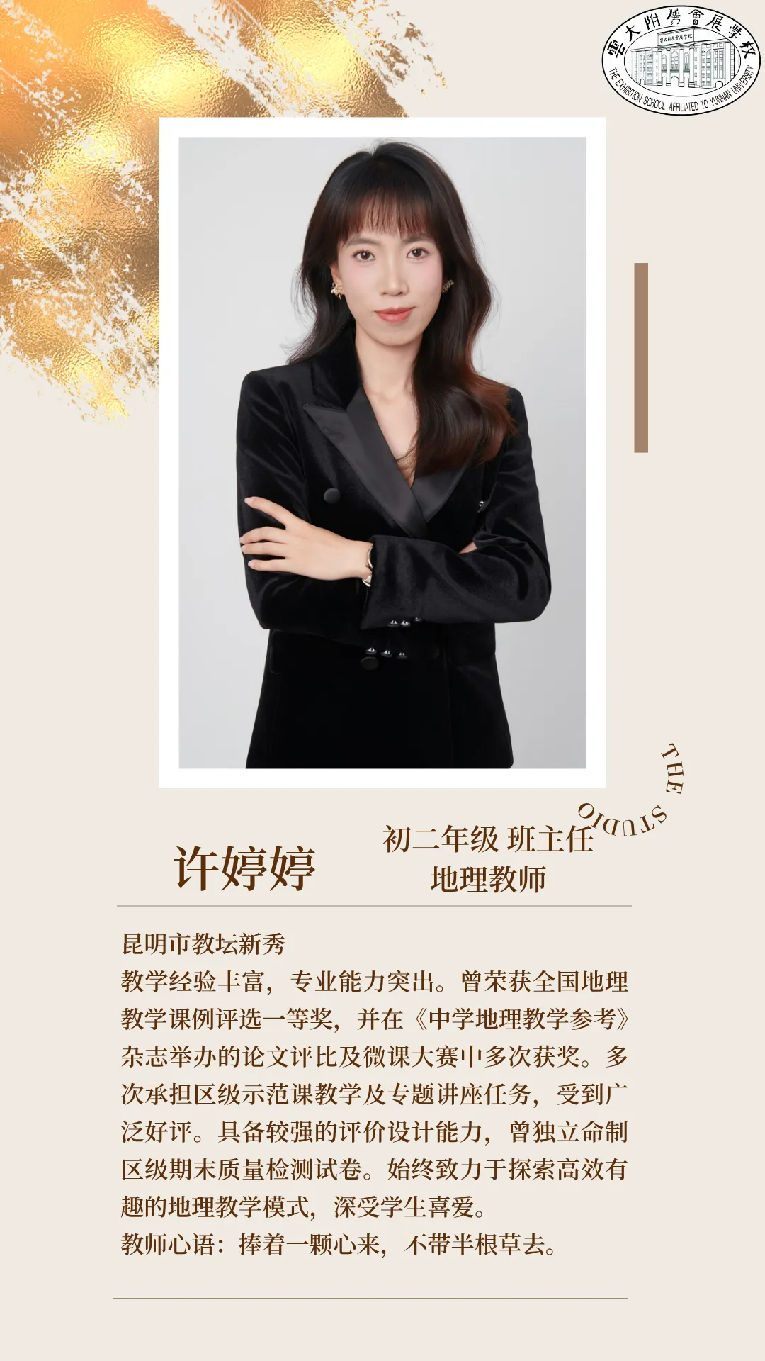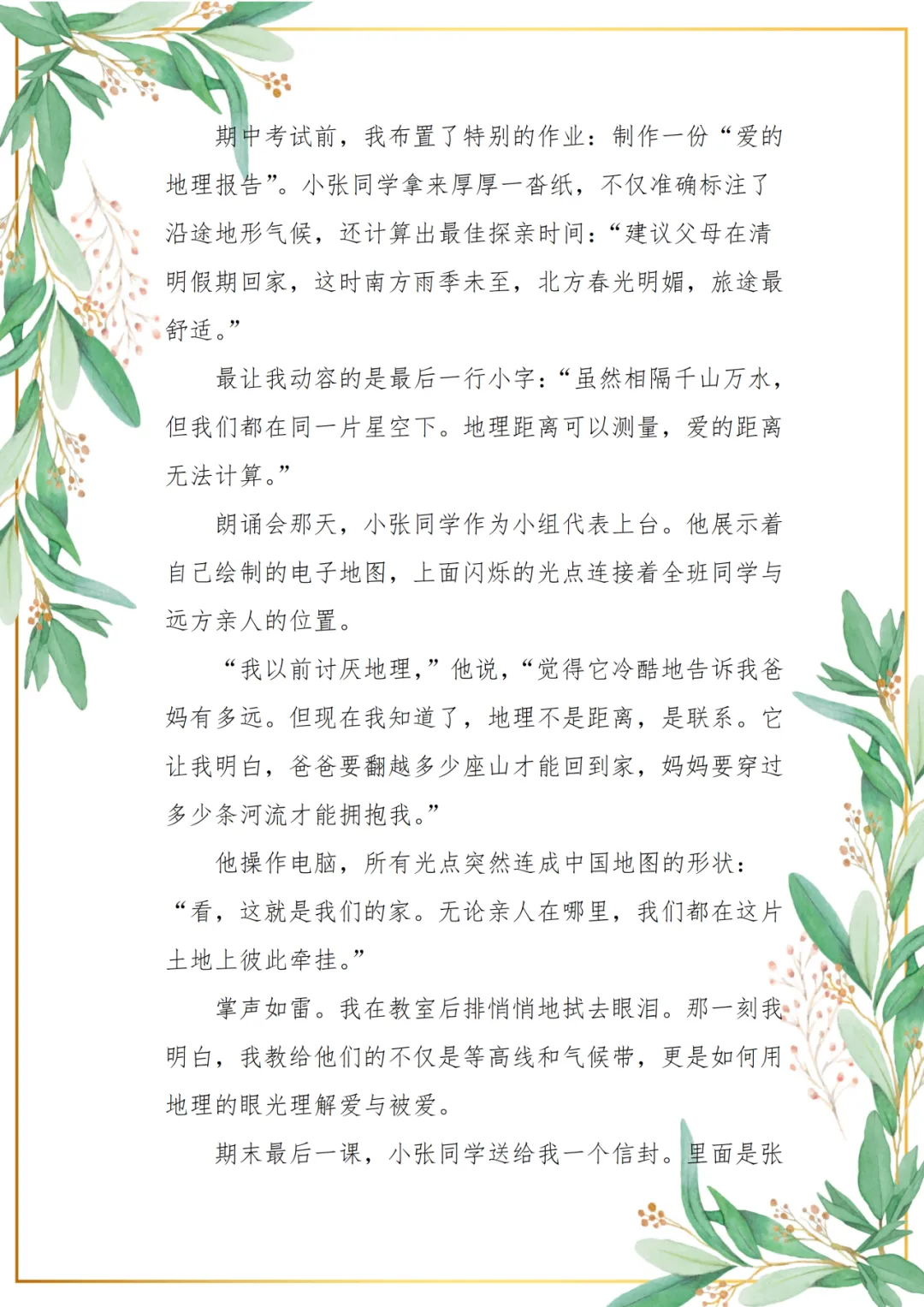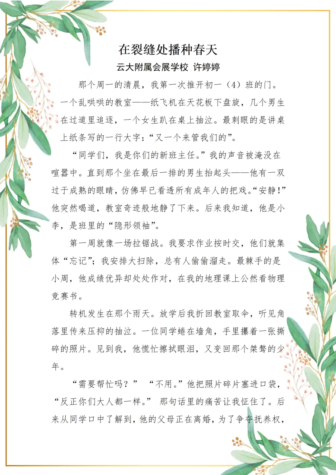 许婷婷老师透过喧嚣与桀骜的表象,看见了一群孩子藏在叛逆里的孤独呼喊。那些成长中的创伤、思念与敏感,像一道道青春里的裂缝。许老师以温柔为锄,在这些裂缝间播下理解与爱的种子:她用一封写给思念之人的信,叩开孩子紧闭的内心;以“日记对话”为桥,接住孩子们无处安放的情绪;更将地理课堂化作丈量爱的航道,让等高线与气候带,变成连接亲情的经纬。这些点滴微光汇聚成河,便是许老师作为师者的智慧与担当。