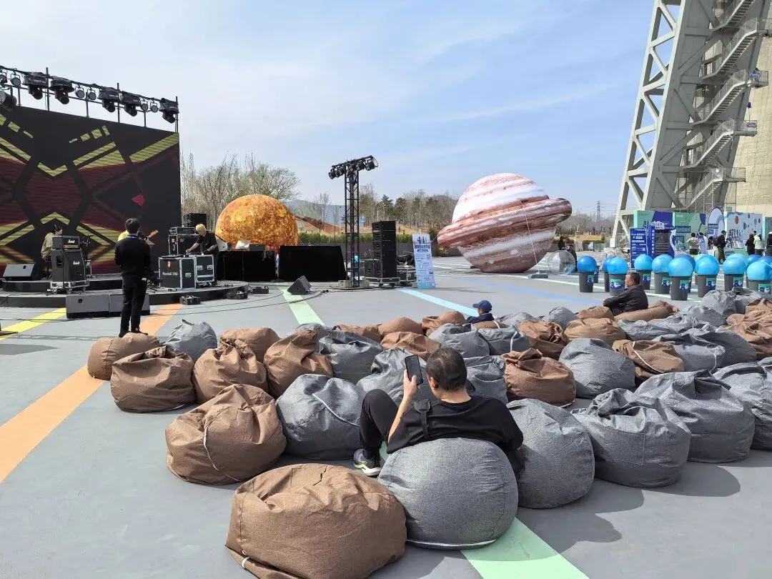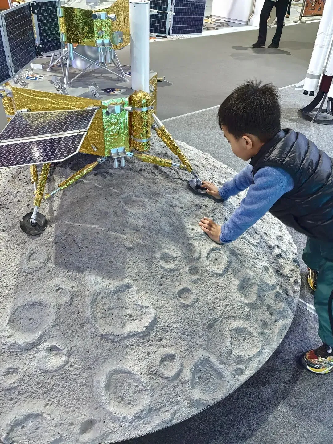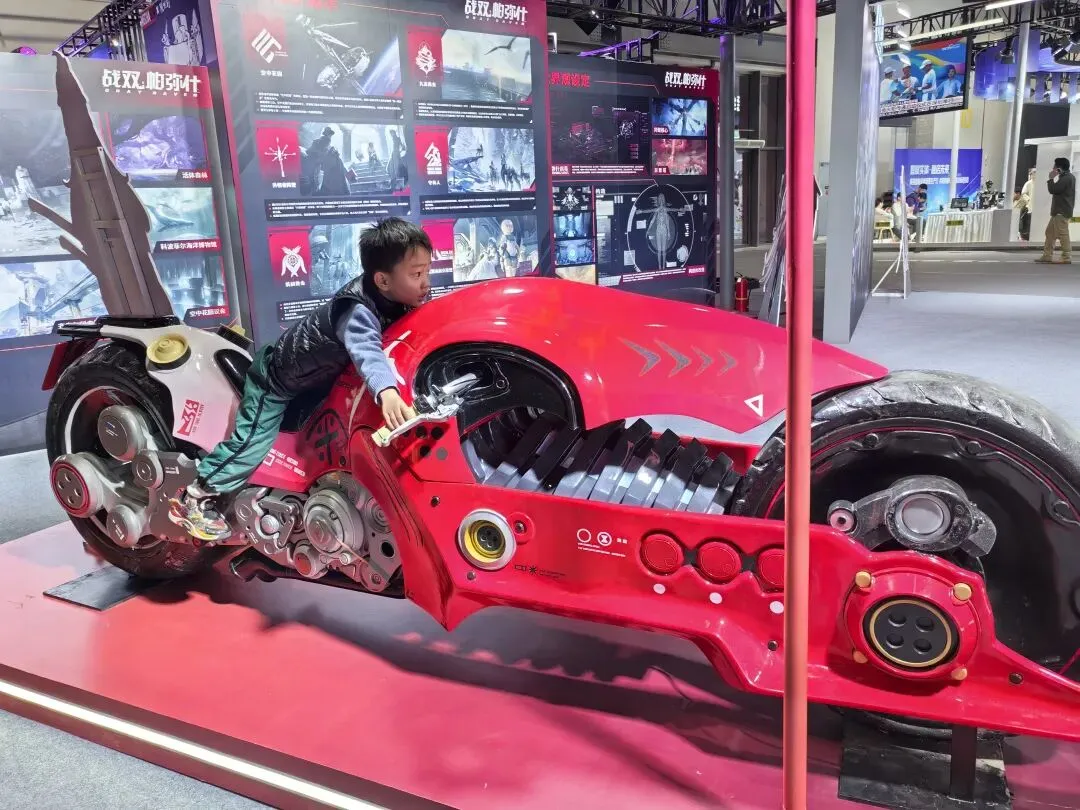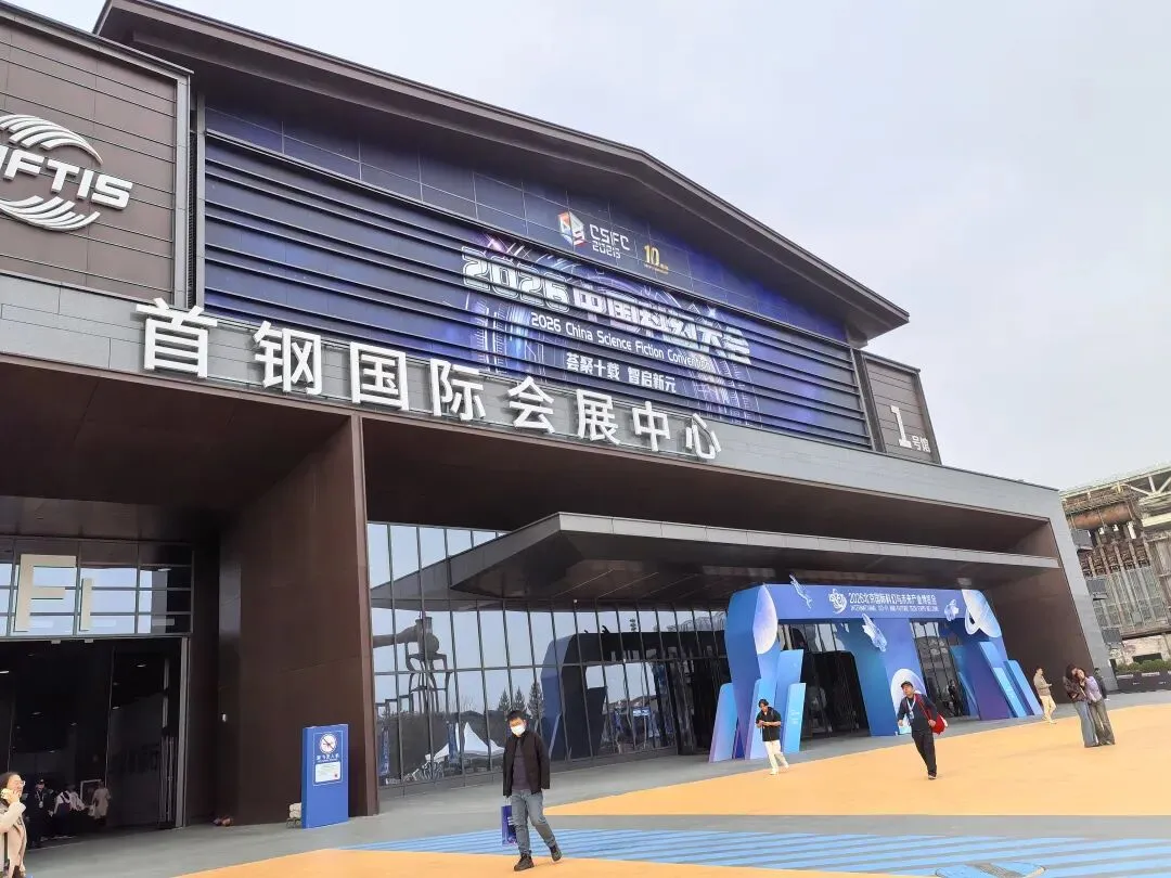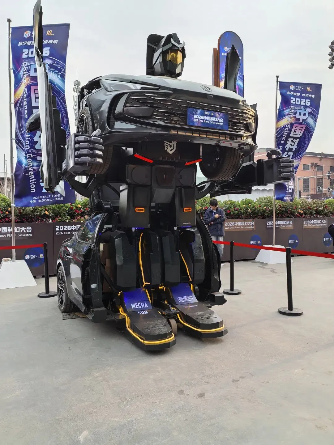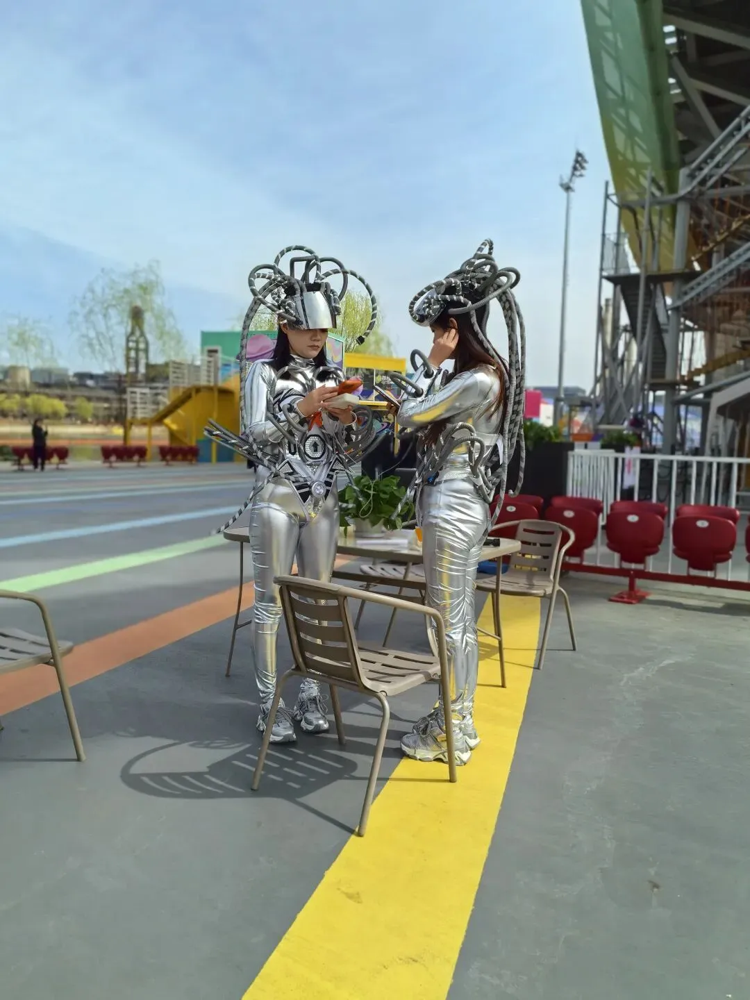 从一个红色大圆盘楼梯走上栈道,中途娃看见了大跳台,要去,在这里又待会好一会儿。主要是在没什么人的情况下第一排听乐队演唱,然后在周围各种人少的情况下体验,包括彩绘,空气吉他,手掌粘上颜料按彩色手印等。舞台这里还有抽奖游戏,方法是扫码,然后主办方抽取,抽中了会公布头像和微信名,奖品有冰箱贴等。 这里还有身穿太空服的小姐姐们走开走去(巡游),听到其中一个男孩子说被小朋友叫阿姨了,可能因为他发型中长发。 在这边还可以点外卖在室外吃中饭,外卖能送到很近的位置。有桌椅,旁边还有卫生间洗手之类的。果果吃饭的时候,还寻觅了一个好朋友,两妈两娃组队成功。 我们从大跳台往会展中心走,两孩子追着跑,玩起来更有劲儿了。中途还去岔空选了一下之前的照片。 最后四点多才到会展中心,进门就看到变形金刚(非电影版),走的时候看见了怎么机器人变车,太酷了! 展厅里很多企业,还有一些高校,初看一遍感觉互动没有去年多。但是也足够娃们玩得不亦乐乎啦。看宇树机器狗和机器人跳舞就能看好一会儿。我们只看了一半的样子就下班关门了! 除了这几个,还有一些点位很值得探索,带娃一天之内感觉都很难走到。 下午五六点我们才上了地铁,果果还一定坚持再要去S1,俩娃难舍难分,最后还一起看了车调头,吃了晚饭。 总之,逛科幻展,请做好日行两万步的准备!这么好的的展还免费,人肯定多,注意一定一定看好自家娃(参考进门签的儿童参观协议)!