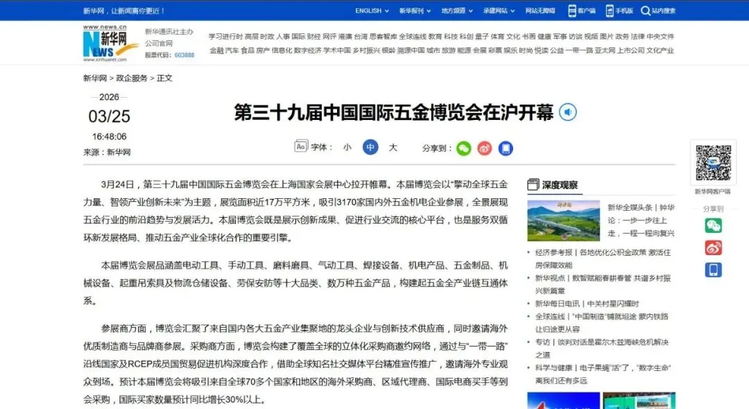(新华网报道)3月24日,第三十九届中国国际五金博览会在上海国家会展中心拉开帷幕。本届博览会以“擎动全球五金力量、智领产业创新未来”为主题,展览面积近17万平方米,吸引3170家国内外五金机电企业参展,全景展现五金行业的前沿趋势与发展活力。本届博览会既是展示创新成果、促进行业交流的核心平台,也是服务双循环新发展格局、推动五金产业全球化合作的重要引擎。
