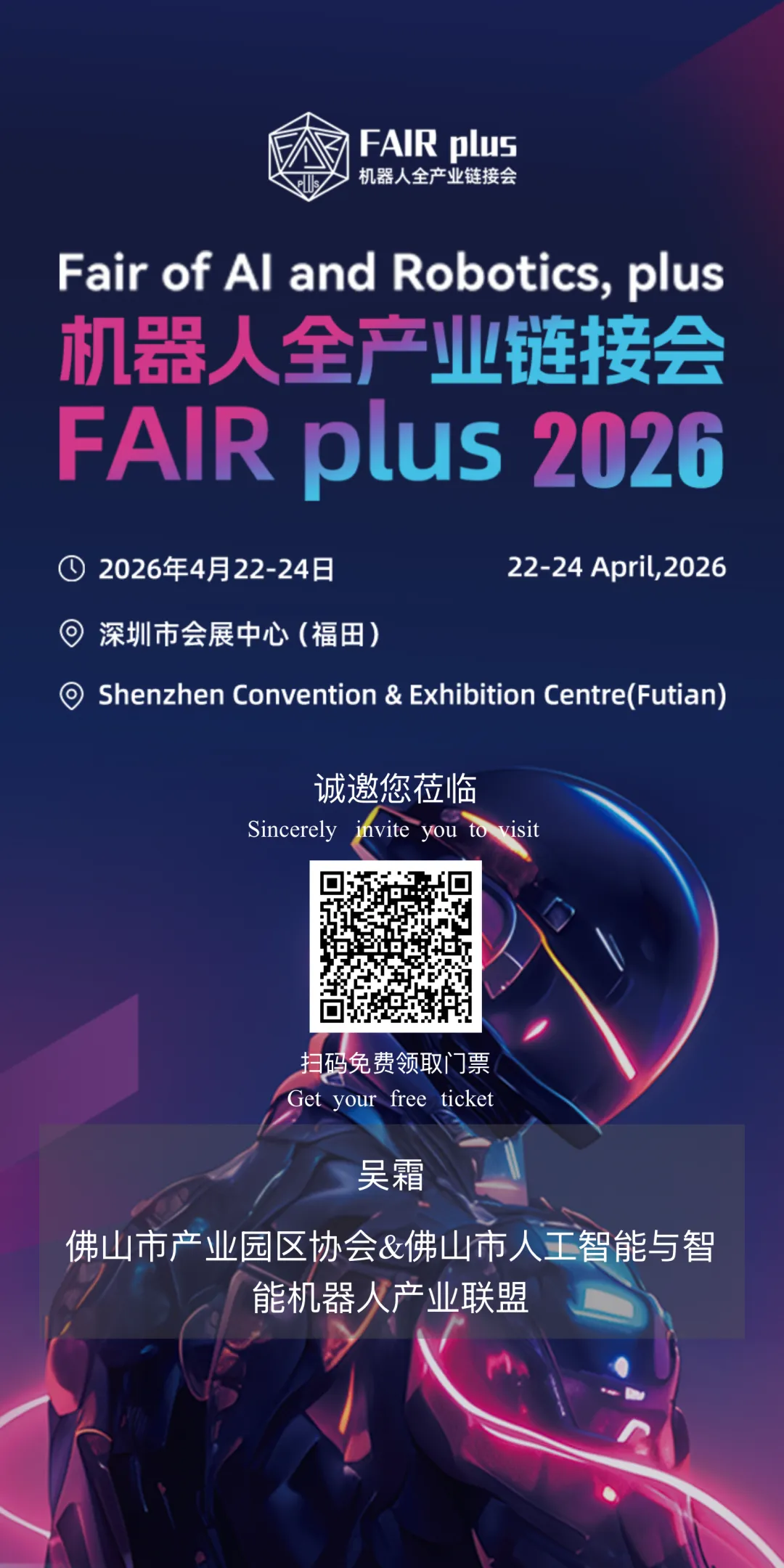 2026年4月22日-24日,FAIR plus机器人全产业链接会将在深圳会展中心(福田)隆重启幕。应大会会务组邀请,现组织我会会员单位、联盟成员单位参加该会,具体会务信息见下,欢迎大家报名参会!