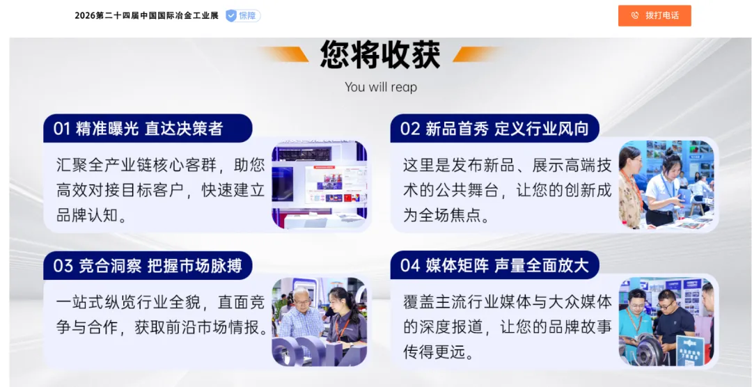 经过三十多年的发展,展会已经成为中国最权威的行业盛会和把握冶金行业技术趋势的风向标.中国国际冶金工业展览会将立足钢铁行业高端化、智能化和绿色化转型,围绕产业链及生态圈绿色低碳发展,为生态圈企业提供钢铁新技术、新工艺、新装备、新概念模式提供展示平台,为未来产业发展提供交流与合作平台。中国国际冶金工业展览会将为行业打造更高水平的开放型平台,集中展示钢铁产业支撑经济社会持续发展的能力、业绩和雄心,促进产业链衔接、生态圈合作,推动钢铁产业高端化、智能化、绿色化、国际化发展。中国国际冶金工业展览会现诚邀国内外钢铁生产、设备制造(包括钢铁生产设备、节能环保设备、绿色能源设备、热处理技术及设备等)、冶金设计研究院、原辅材料、设计施工、仓储物流、钢材贸易、冶金院校、资产管理和投融资机构及钢铁产业链和生态圈其他相关企业积极参加本届展览会。我们在此诚挚地邀请您参加本届展览会,并将努力为您参展和参观提供一切必要的方便和良好的服务。