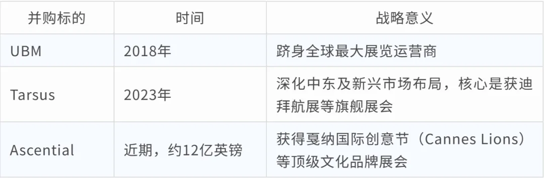 英富曼能在AI浪潮中突围,源于过去十年一场深思熟虑的战略重构。曾几何时,投资者将英富曼归类为传统媒体股——旗下的Pharma Intelligence、Lloyd's List等出版业务,以及对营销和差旅预算的高度依赖,使其背负"强周期性"标签。2008年金融危机和2020年新冠疫情的两次重创更深入人心,当时集团被迫紧急融资,留下难以抹去的心理阴影。这些并购将英富曼的展览组合从普通行业展览,升级为各自领域不可或缺的"必参与"盛事:- 戛纳国际创意节:被誉为广告与创意界的"奥斯卡",全球顶尖品牌主、代理商与创意人的年度朝圣地;