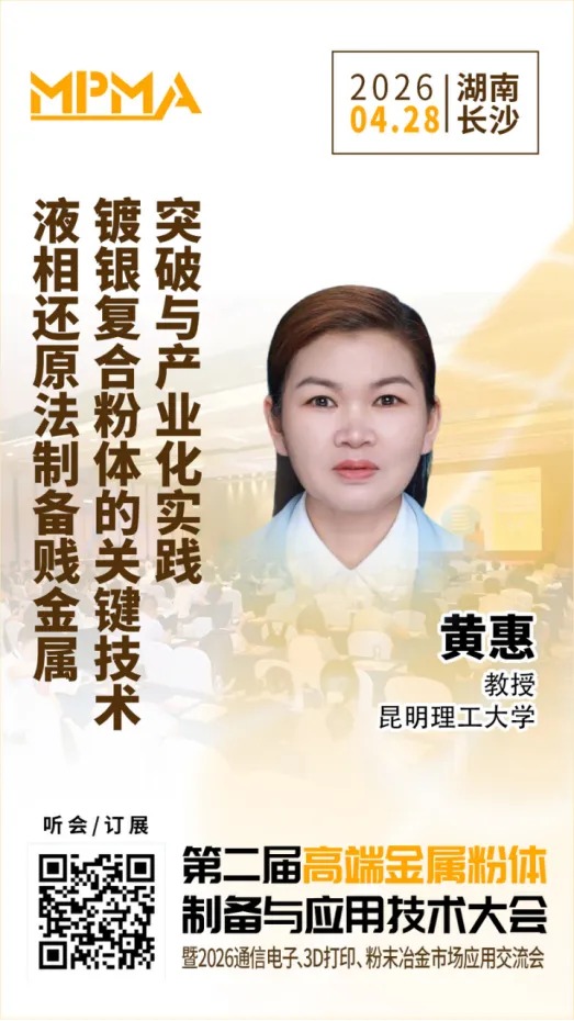 2026年4月28日,中国粉体网将在湖南·长沙举办“第二届高端金属粉体制备与应用技术大会暨2026通信电子、3D打印、粉末冶金市场应用交流会”。届时,我们邀请到昆明理工大学黄惠教授出席本次大会并作题为《液相还原法制备贱金属镀银复合粉体的关键技术突破与产业化实践》的报告,黄惠教授将系统阐述在液相还原法构筑贱金属镀银复合粉体过程中Cu@Ag、Ni@Ag和Al@Ag等制备关键技术突破,以及绿色环保与过程放大控制技术。