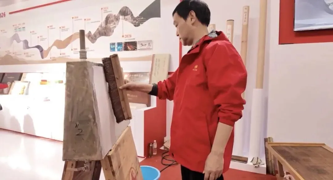 此次展览是“宣纸”国家地理标志证明商标成功注册后的首个行业大展。红星宣纸此次亮相,不仅集中展示经典产品与创新成果,更将宣纸文化作为核心表达,实现从“产品展示”到“文化传播”的跃升。展会现场,循环播放三丈三宣纸生产与红星品牌宣传视频,宣纸传统制作技艺中的捞纸、晒纸核心工序同步开展活态展演,让观众近距离领略青檀树皮与沙田稻草交融蜕变的非遗魅力。与此同时,我们不仅带来了棉料、净皮、特种净皮等经典拳头产品,更将2026年央视春晚惊艳亮相的三丈三巨幅宣纸、多款市面罕见的宣纸收藏珍品,与各类宣纸文创产品一同展出,生动地将宣纸与现代生活美学相融,让这张中华文化“名片”从艺术家案头真正走进寻常百姓生活。从2008年奥运会到2026年央视春晚,红星宣纸屡次登上国家级舞台,已成为中华文化的重要符号。而此次文房四宝博览会,则让我们得以直面核心用户与广大文房爱好者,让更多人亲身感受宣纸的文化温度。宣纸不仅是中国传统书画的载体,它正成为中华文化出海的重要载体,走向更广阔的世界舞台。