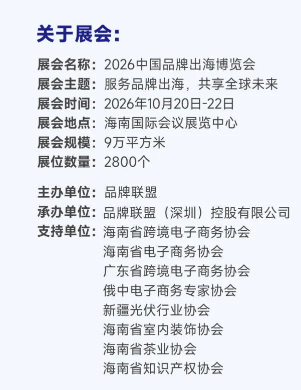 全球数字经济发展与“双循环”格局深化下,出海成为中国品牌增长必然选择。海南作为面向东盟的战略支点、中国特色自由贸易港,凭借零关税等政策红利与6小时亚太经济圈区位优势,成为品牌出海重要跳板。2026中国品牌出海博览会应运而生,以国家级、国际化、专业化为定位,集成果展示、供应链对接、政策解读等核心功能于一体,赋能中国品牌走向世界,助力海南自贸港成为双循环交汇点。