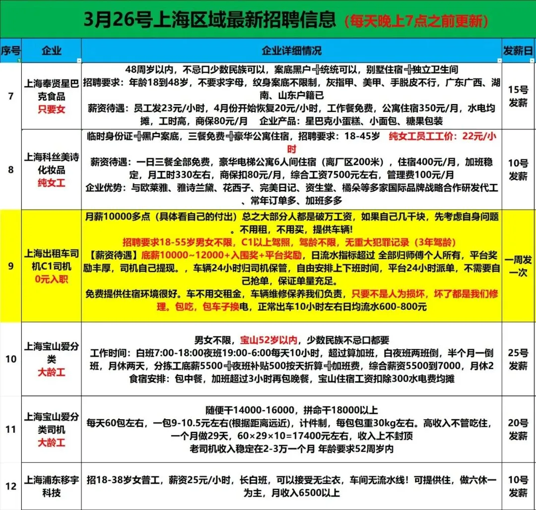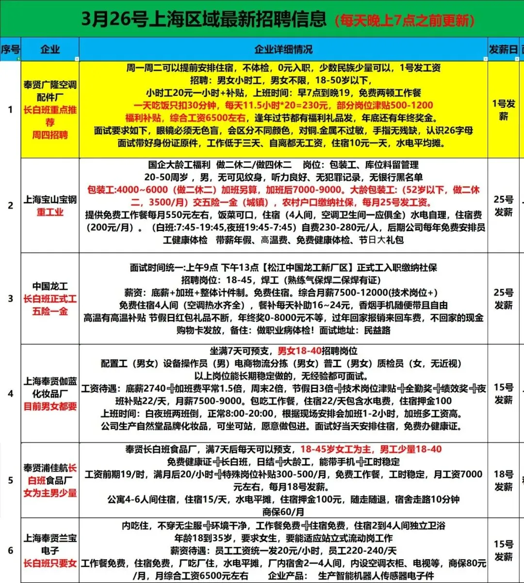 12:30 之前到,延锋 发泡车间日结 27 元/小时,月结 29 元/小时,男女都行