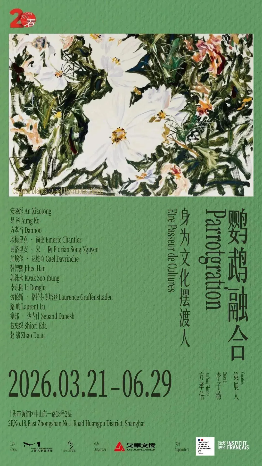 外滩18号久事艺术空间2026开年首展“鹦鹉融合——身为文化摆渡人”,于2026年3月20日正式启幕。本次展览由上海久事美术馆与巴黎A2Z画廊共同主办,李子薇、方孝信担任策展人,获法国驻上海总领事馆的支持,并纳入2026年第二十届“中法文化之春”官方项目。展览汇聚15位中外多元文化背景艺术家的70余组精品力作,涵盖油画、水墨、丙烯、综合材料等多种艺术形式。展期内免费向公众开放,将持续展出至2026年6月29日。
