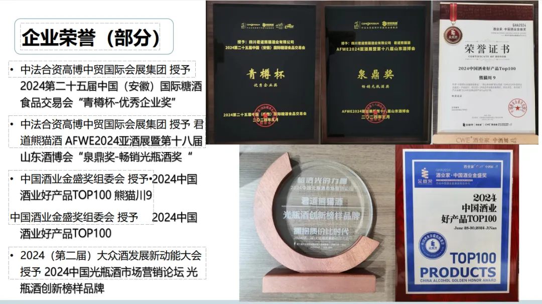 从产品设计上看,君道熊猫酒的瓶身设计简约光洁,无繁复装饰,凸显 “纯净高雅” 的视觉气质,呼应君子温润如玉的品格。在奖项方面,君道熊猫酒荣获了多项行业权威奖项,像 2024 中国酒业好产品 TOP100(熊猫川 9)、2024 中国光瓶酒市场营销论坛 “光瓶酒创新榜样品牌”、AFWE2024 亚酒展暨山东酒博会 “泉鼎奖 - 畅销光瓶酒奖” 等,这些荣誉体现了市场与行业对它的高度认可。