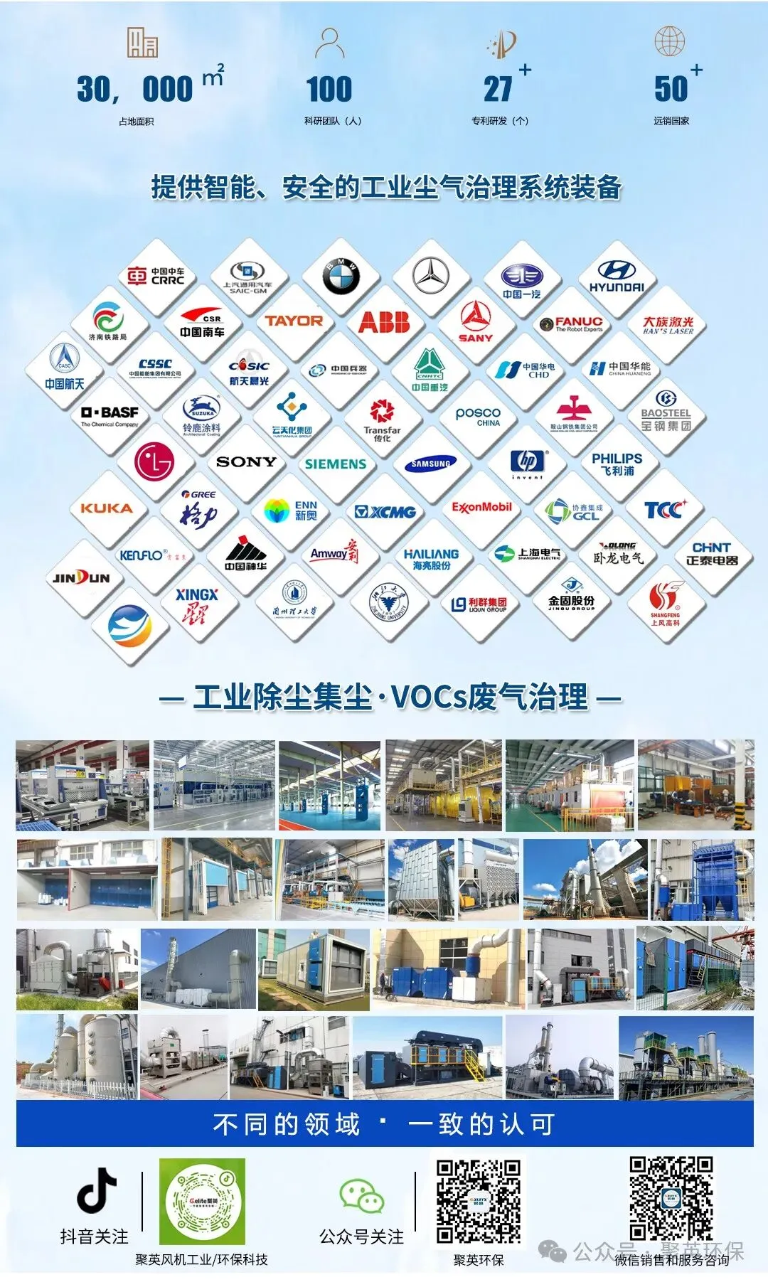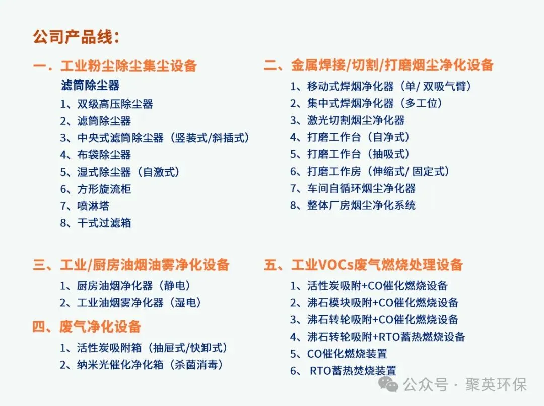 浙江聚英环保科技有限公司(以下简称:聚英环保)位于浙江、绍兴、上虞,厂房占地20000㎡,配备ABB、大族等品牌自动化的生产装备和完善的生产管理体系。公司主要致力于工业厂房内的除尘集尘和VOCs废气治理,为企业提供个性化的精准治理方案、高效的专用环保设备、专业的系统安装售后等完善的一站式服务。