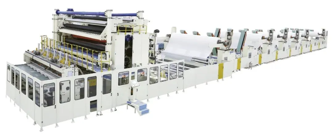 作为欧克科技抽纸生产线的核心设备之一,主要用于高速软抽纸的自动折叠生产。该设备幅宽达到5600mm,采用全伺服控制技术,运行过程中稳定性较强,相较于传统折叠机,其首抽半折采用真空吸附方式处理,有效提升了折叠的规整度,减少了卡纸、折边不齐等问题的出现。配套的多通道大回旋切纸机,进一步提升了裁切精度与效率,主机速度可达200米/分钟或15条/分钟,整线配置了条纸储料架及单包储料架,能够实现物料的缓冲与合理分配,避免出现物料堆积或供应不足的情况。