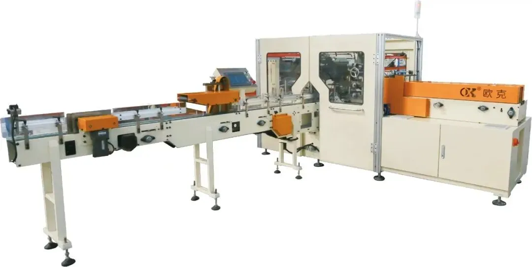 专注于盒抽纸巾的自动化装盒包装,进一步完善了欧克科技抽纸生产线的全流程覆盖。该设备采用自动送料、开盒、入盒、喷胶、封盒的一体化包装形式,结构紧凑合理,操作调整简单,能够大幅减少人工投入,降低企业的劳动力成本。设备配备伺服电机和触摸屏、PLC可编程控制系统,自动化程度较高,人机交互更加人性化,工作人员可通过触摸屏轻松设置参数、监控生产状态。