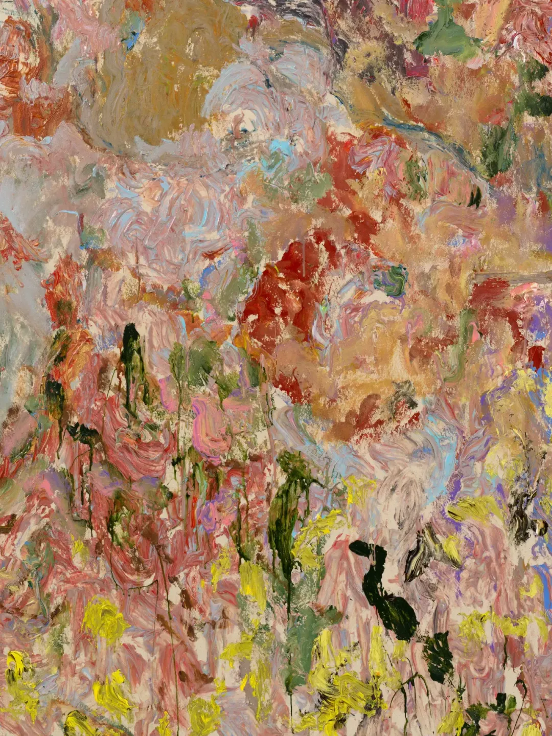 这些作品唤起人们对文森特·梵高(Vincent van Gogh)田野与皮埃尔·博纳尔(Pierre Bonnard)花园的记忆。在那里,颜料既表现物质,也作为物质本身显现,色彩在其中获得一种欢愉与释放。它们亦令人想起保罗·塞尚(Paul Cézanne),这位被彭斯视为重要转折点的艺术家:“你会明白,当摆脱了关于绘画应当如何呈现的那种僵化观念之后,这一过程经历了极为漫长的时间,几乎直到20世纪,塞尚才真正开始仅以色彩作画。人人都在画风景,但他的作品为何与众不同?”(2)换言之,这是一种绘画表面的到来,色彩不再只是描述性的工具,而是为自身而存在。