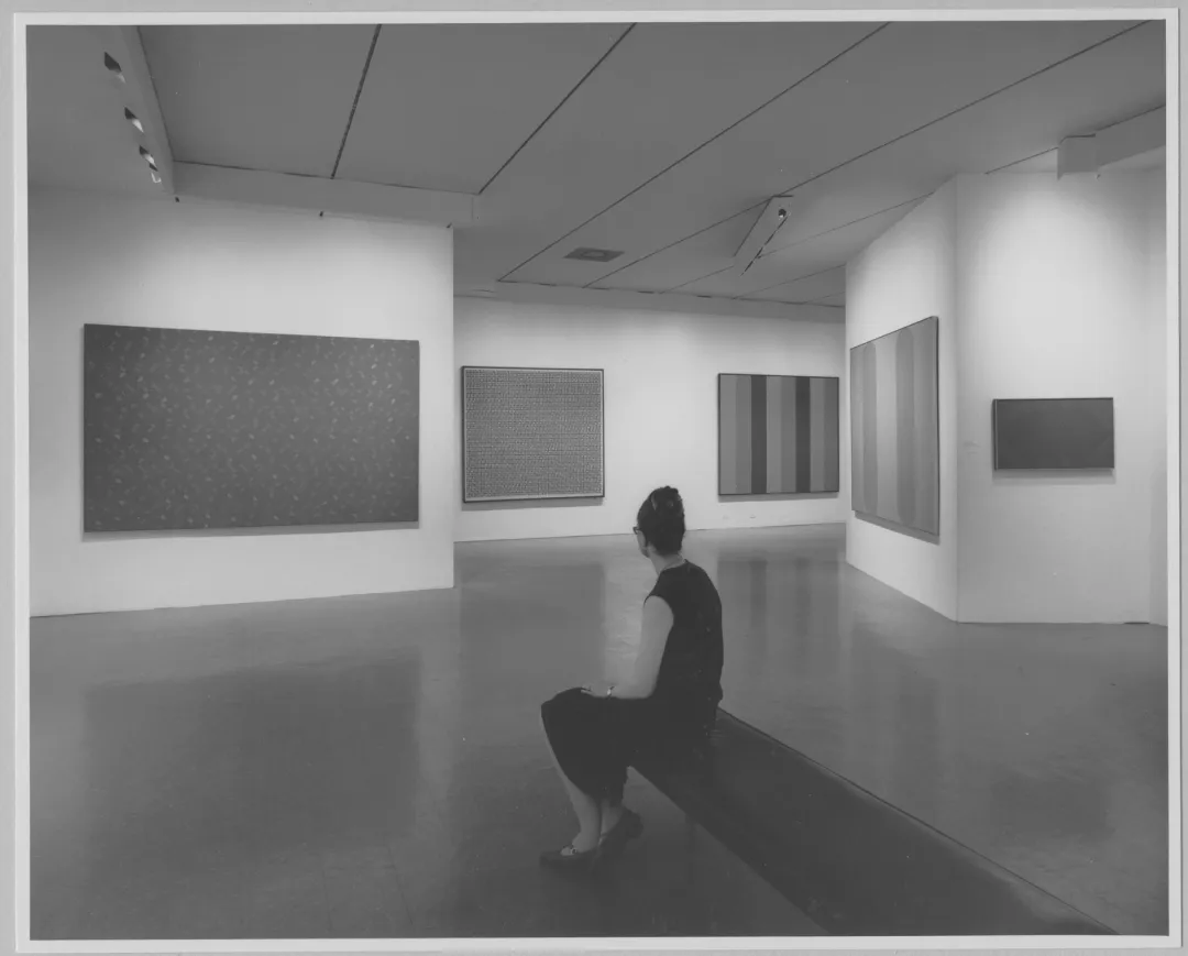 在那次决定性的音乐体验之后约十年,彭斯完成了他的第一幅绘画《摇滚乐》(Rock and Roll,1958),一件抽象几何作品。这位兼具画家与音乐家身份的艺术家,自1961年起便与好友沃尔特·德·玛利亚(Walter de Maria)、拉·蒙特·扬(La Monte Young)以及贾斯珀·琼斯(Jasper Johns)进行非正式的音乐聚会,并逐步发展出一种光学抽象风格。他著名的“点绘画”系列(Dot Paintings),是欧普艺术(Op art)最早的绘画实验之一。因此,他入选1965年纽约现代艺术博物馆举办的「感官之眼」(The Responsive Eye)展览,其中展出的《尼克斯的伴侣》(Nixe’s Mate,1961)即来自该系列。该展览在推动欧普艺术获得国际认可方面发挥了关键作用,同时也通过呈现后绘画性抽象与色域绘画的作品,对这一趋势形成了某种平衡。