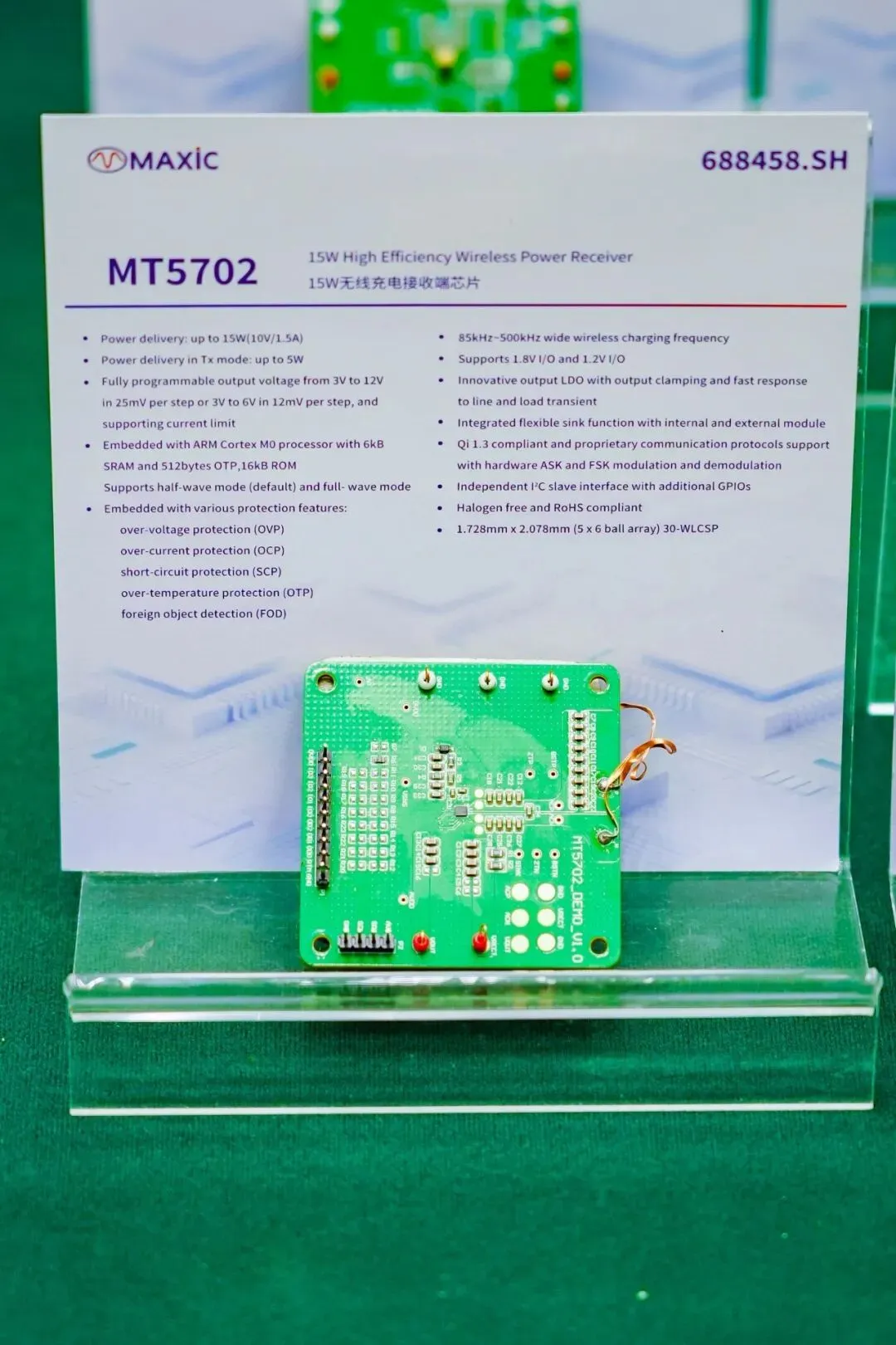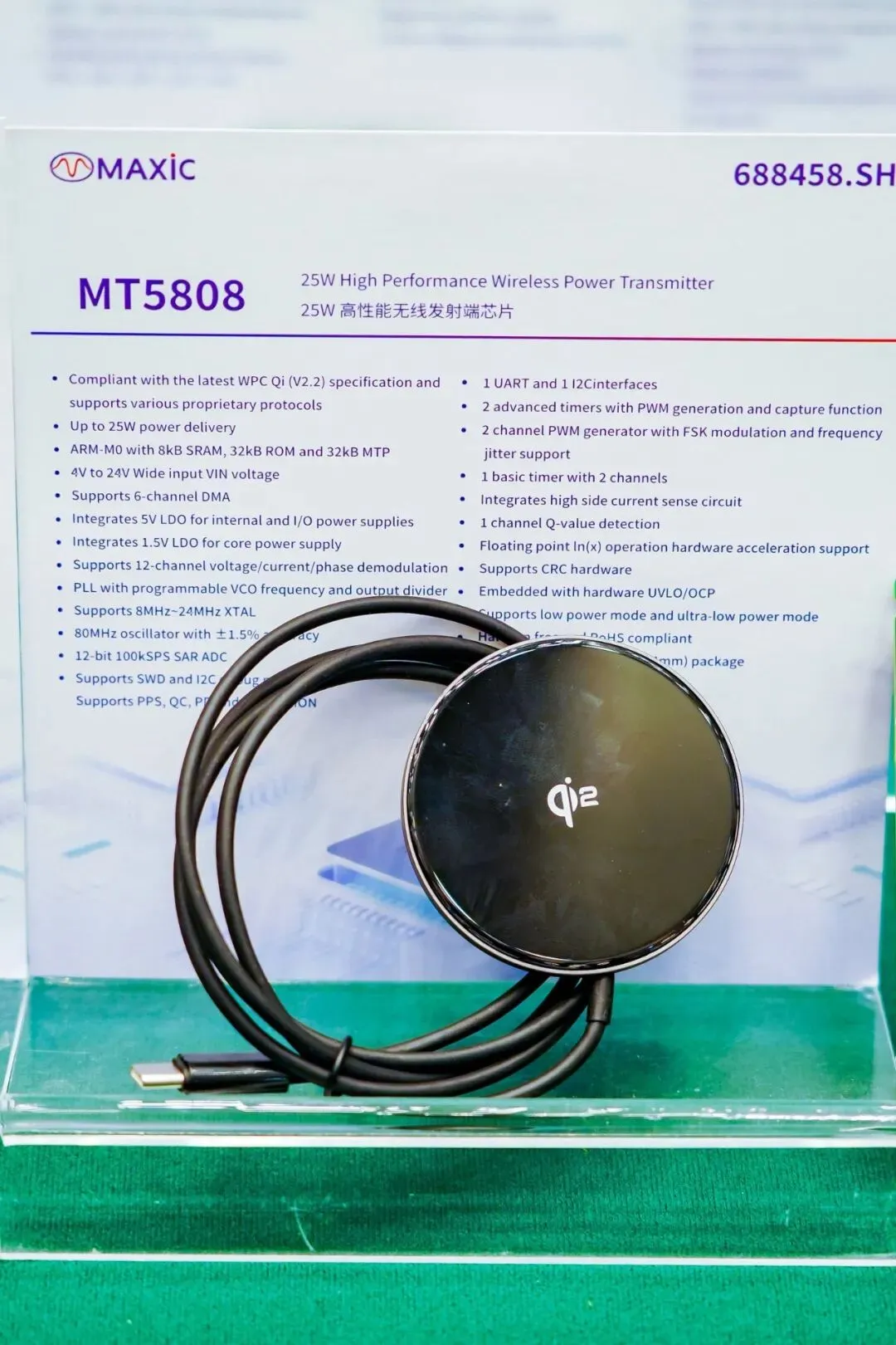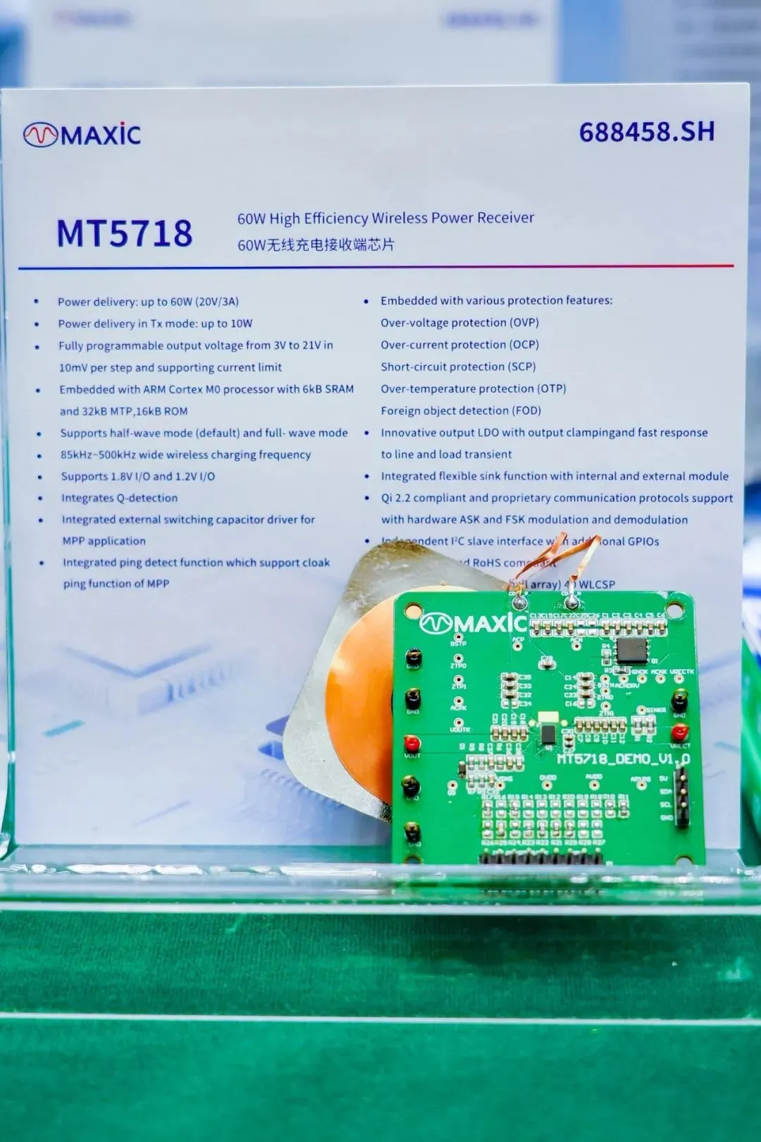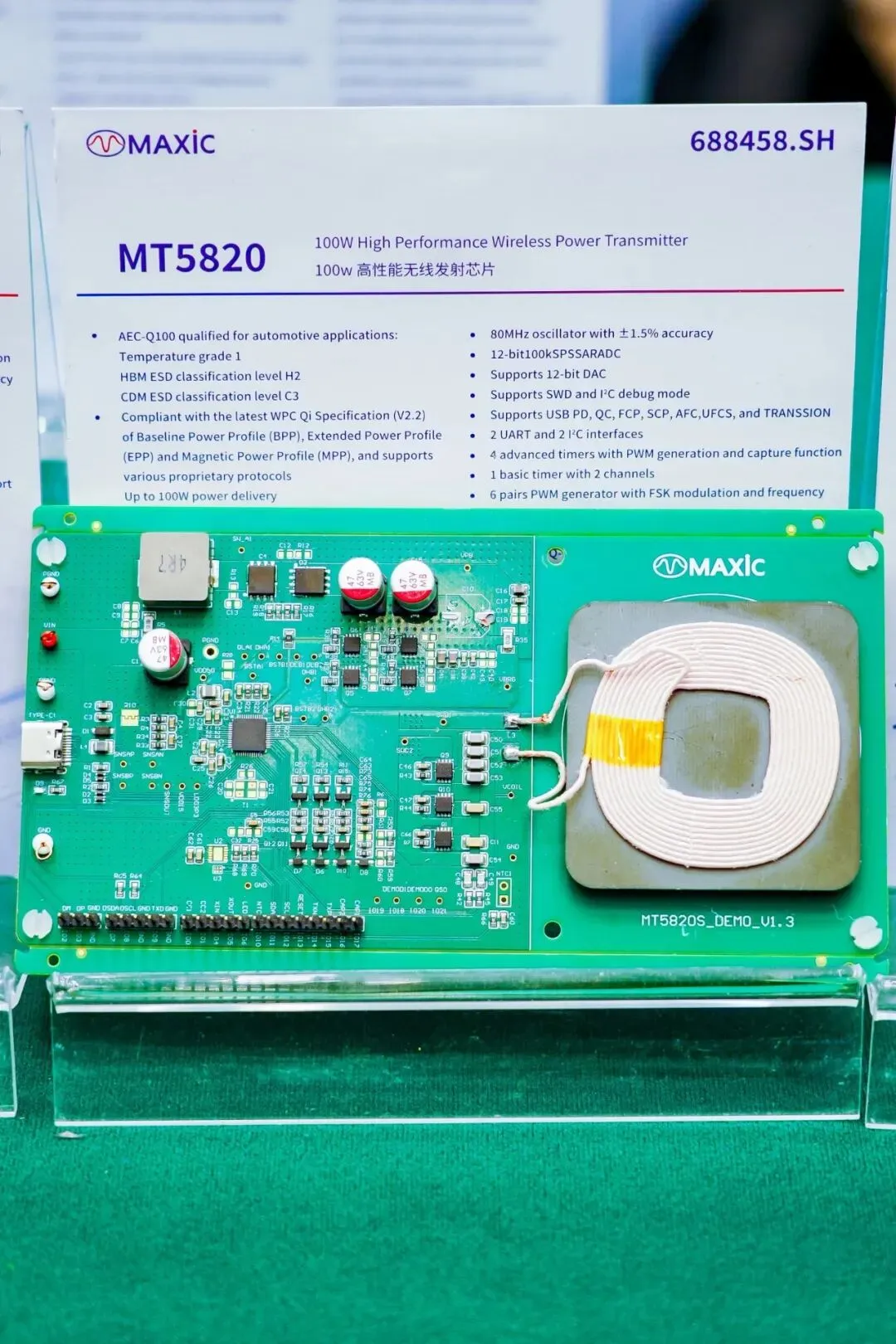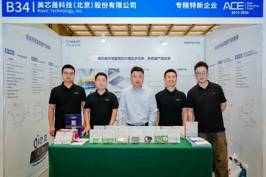 2026年3月27日,由充电头网主办的2026(春季)亚洲充电展在深圳前海国际会议中心盛大启幕,汇聚100多家行业知名展商,实现产业链核心环节高质量覆盖。美芯晟受邀出席此次展会,重点展示了全功率段无线充电解决方案,满足大功率,中小功率及车规级等多功率段,可广泛应用于消费电子、智能家居、汽车电子、工业控制、医疗设备等多终端产品。在无线充电接收端,带来重磅产品MT5702、MT5718、MT5786等。新品超小尺寸、高度集成、专为小型设备设计的15W无线充电接收芯片MT5702,内置ARM Cortex M0处理器、同步整流器、LDO及多重保护电路。该芯片以极小的封装尺寸实现15W输出功率和95%的转换效率,可广泛适用于手机、手表、耳机、电容笔、电动牙刷等小功率无线充电设备。在无线充电发射端,带来重磅产品MT5808、MT5820、MT5804等。新品MT5808是一款支持MPP 25W 的高性能无线充电全集成发射端芯片,输出功率最高25W,支持4V-24V输入电压,支持6通道DMA,集成5VLDO、80MHz振荡器。MT5820为无线充电发射控制器芯片,完全符合最新WPC Qi2.2标准,支持BPP、EPP和MPP(5W/15W/25W)三种功率配置,集成一芯多充功能,最高传输功率可达100W。