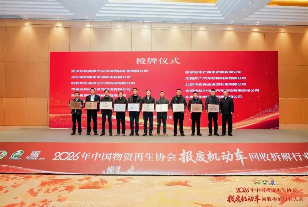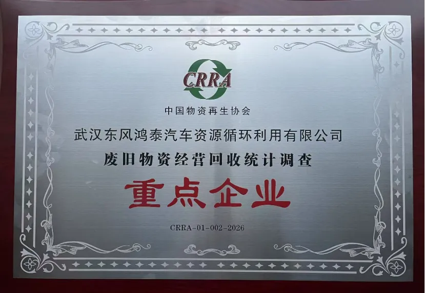 3月26日,“2026年中国物资再生协会报废机动车回收拆解行业大会”在安徽▪合肥隆重举办,现场举行重磅授牌仪式。武汉东风鸿泰汽车资源循环利用有限公司(以下简称“公司”)凭借规范的经营管理、完善的回收体系、突出的行业贡献,成功获评废旧物资经营回收统计调查重点企业(CRRA-01-002-2026),荣获中国物资再生协会官方授牌,成为行业内备受认可的标杆企业,彰显了在报废机动车回收拆解领域的硬核实力与行业公信力。