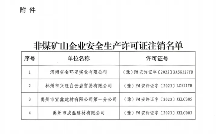 日前,根据《中华人民共和国行政许可法》《安全生产许可证条例》和《非煤矿矿山企业安全生产许可证实施办法》等有关规定,经郑州市应急管理局、安阳市应急管理局、许昌市应急管理局提请,省应急管理厅决定注销河南省金环亚实业有限公司、林州市兴旺白云岩贸易有限公司、禹州市宜鑫建材有限公司第一分公司、禹州市成磊建材有限公司等4个企业的安全生产许可证。