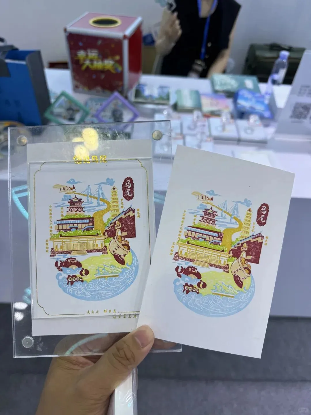 上面遗落了一颗花花绿绿的水果糖,不知道是哪个匆忙的参展商落下的.